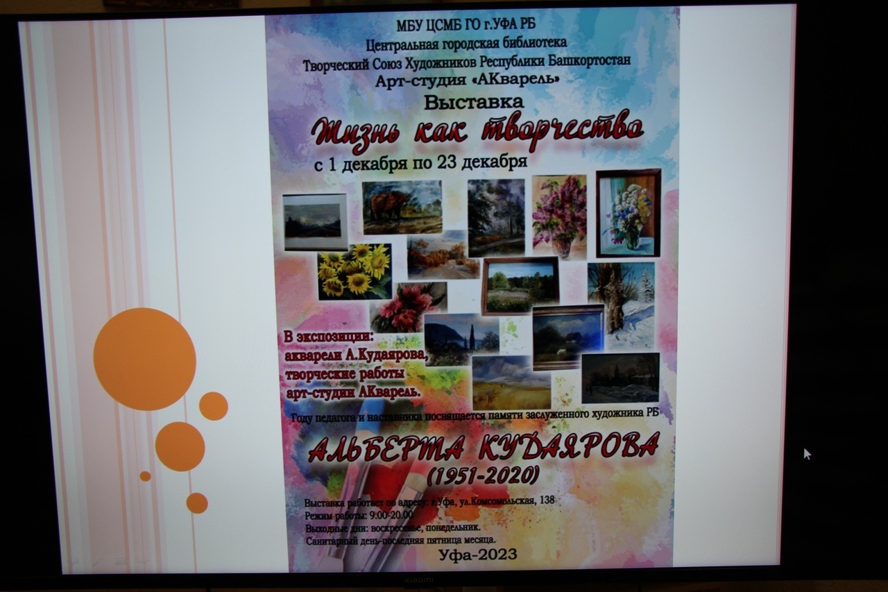 1 декабря 2023 года в Центральной городской библиотеке Уфы открылась выставка «Жизнь как творчество», посвящённая пятилетию арт-студии «Акварель» и памяти живописца, графика, художника декоративно-прикладного искусства, Заслуженного художника РБ, члена Союза художников России Альберта Кудаярова.
