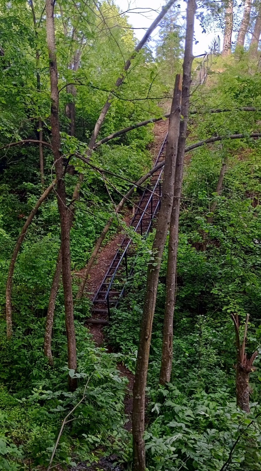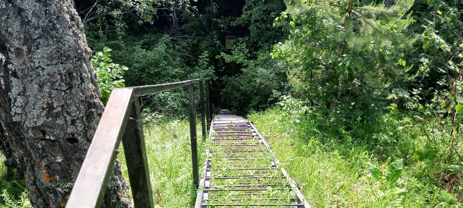 Тем разительнее контраст — с вершины солнечного холма нужно спуститься круто вниз, во влажный сумрак оврага возле реки Меняды. Овраг очень глубокий, и сверху не видно — что там, в тёмной яме, заросшей лесом. К счастью, можно не скатываться кубарем по склону, а спуститься по новой металлической лестнице с перилами.