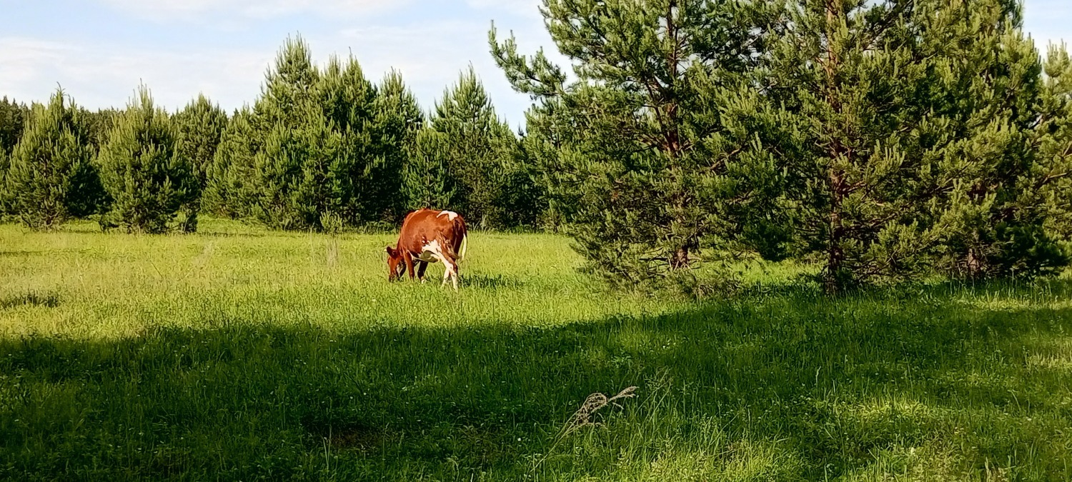 Пригорок возле деревни Орловки порос молодыми соснами. На них сейчас распускается свежая, ярко-зелёная хвоя. Солнечный свет рассеивается между сосенками и заполняет полянки. Свежую травку неспешно жуют упитанные коровы. Под ногами бурно цветёт полевая клубника. Невозможно шагнуть, не наступив на цветы и уже завязавшиеся ягодки. Этот год будет очень клубничным.