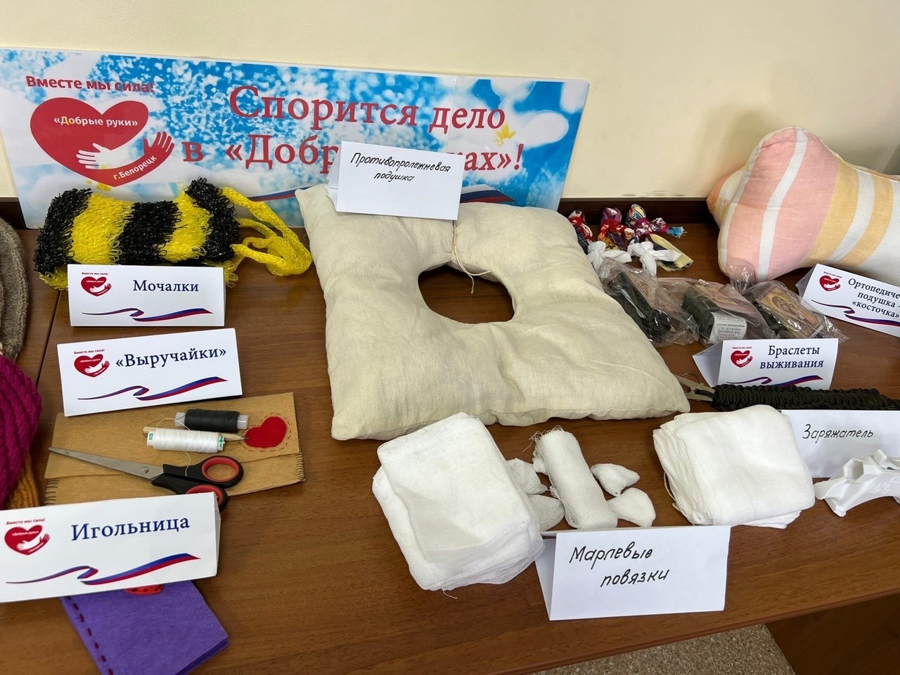 Наши мастерицы шьют и вяжут бахилы, коврики, пледы, рюкзаки, вещмешки, нашлемники и подшлемники, пояса, бандажи для раненых, носки, специальные варежки, манишки, мочалки, марлевые повязки, подушки, шорты, брюки, рубашки, плетут браслеты выживания.