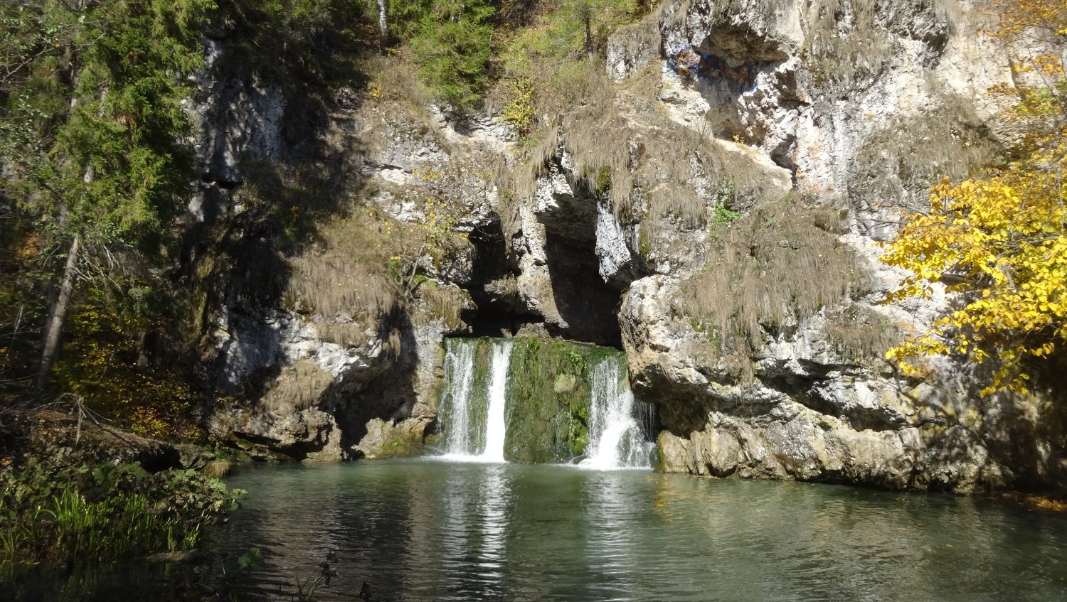 По пути к водопаду находится очень живописная скала Калим-Ускан с небольшой пещерой. Излюбленное место для скалолазов.