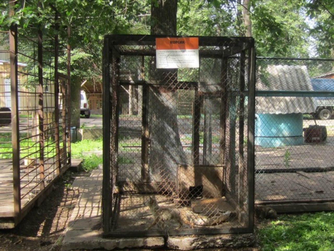 Рядом с рысью располагалась клетка лисы, а рядом – корсака. Оба животных – худые, облезлые, изможденные… У корсака клетка совсем крохотная – метр на метр! Уж не знаю, есть ли правила содержания животных в зоопарке, но здесь они точно не соблюдаются! Самого корсака на фоне клетки практически не видно – интересно, его вообще кормят?