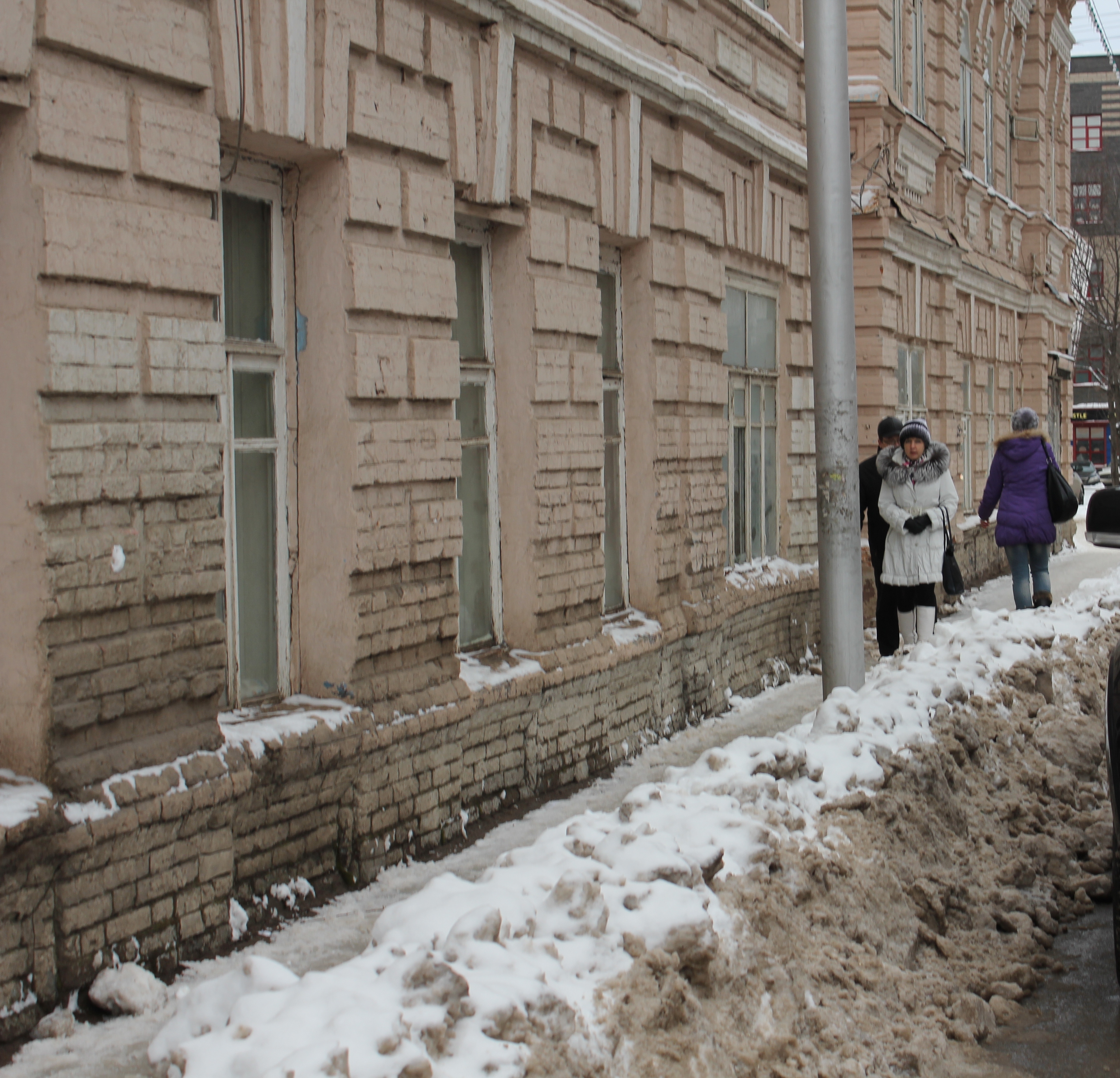 К тому же сужение тротуаров до невозможно малых размеров, где и два человека с трудом разминутся, самым прямым образом сказывается и на поведении горожан. Сужу по себе. Признаюсь, что никогда не отличалась пробивным характером, всегда во всем старалась людям уступать, списывая такую не совсем удобную в быту черту на воспитание и добропорядочный нрав. А тут, сломя голову несясь по узенькой пешеходной дорожке буквально под заснеженной покатой крышей дома, оттолкнула шедшую навстречу женщину (слава Богу, не старушку немощную). Извините, как говорится, не до любезностей, самому бы живым остаться.