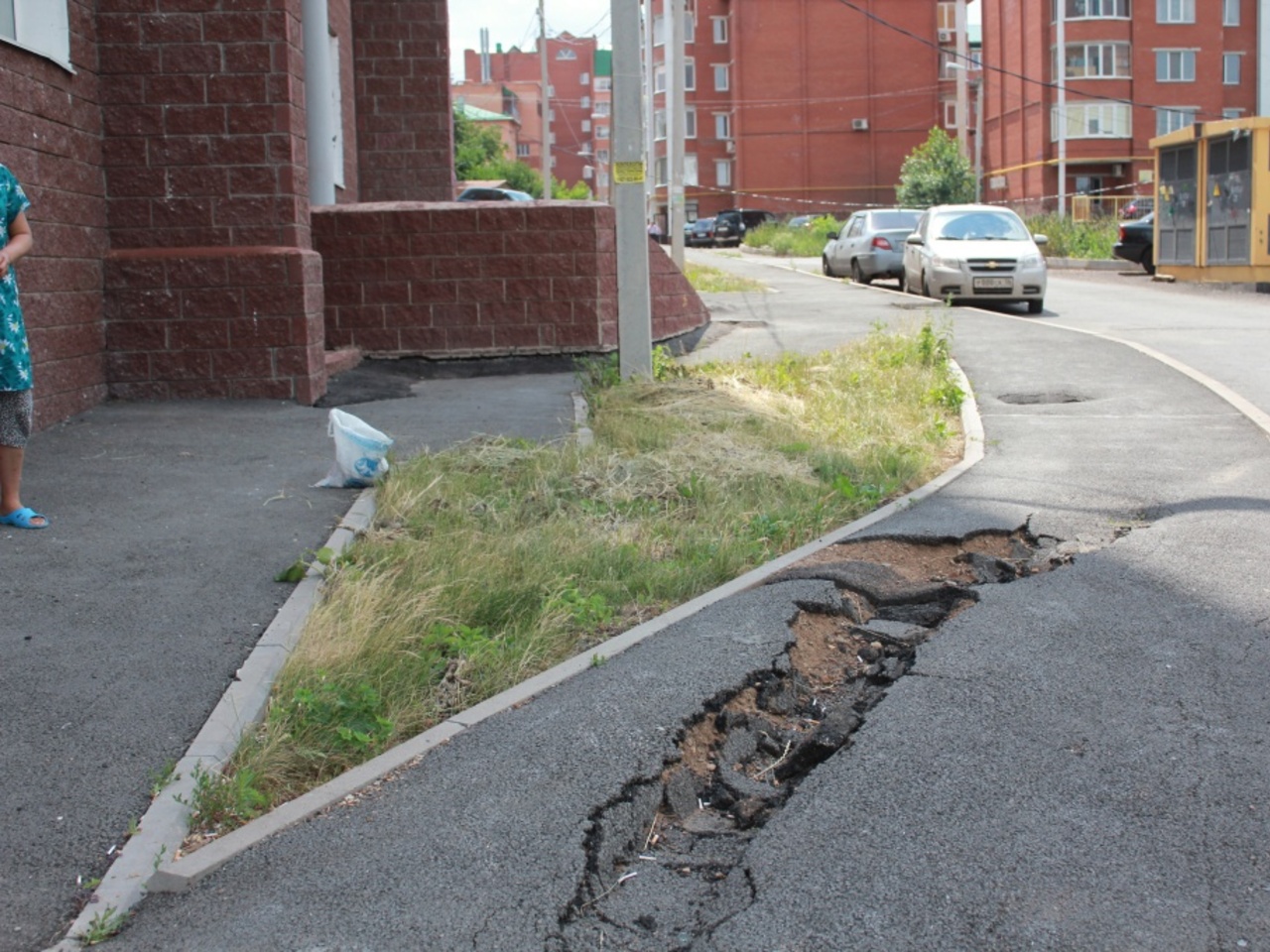 Впрочем, отправляюсь далее, не забывая о главной цели путешествия. Среди новых домов, в общем-то, можно констатировать, асфальт положен. Только ведет он себя как-то странно. То словно пляшет-гуляет по кочкам, а то ползет вот такими трещинами.