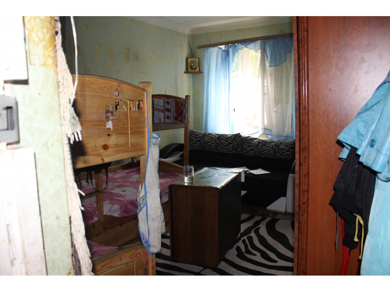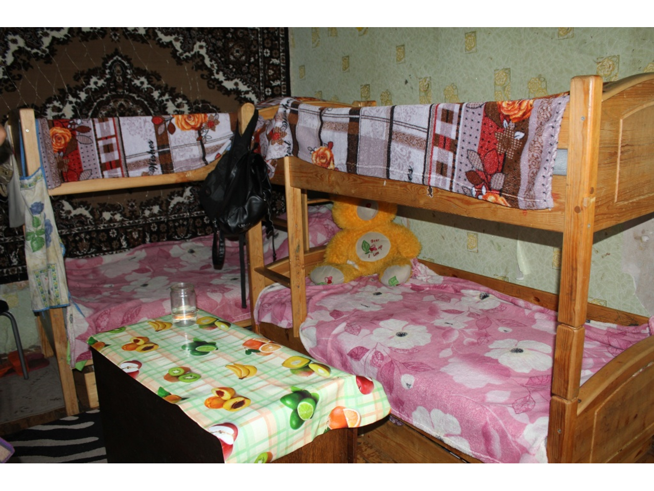 Двухэтажный дом 50-х годов постройки выглядит, мягко говоря, неприглядно. Но внутри гораздо хуже. Крохотная, тесная комнатка с ветхими полами, — просто удивительно, как здесь помещается семья из семи человек!