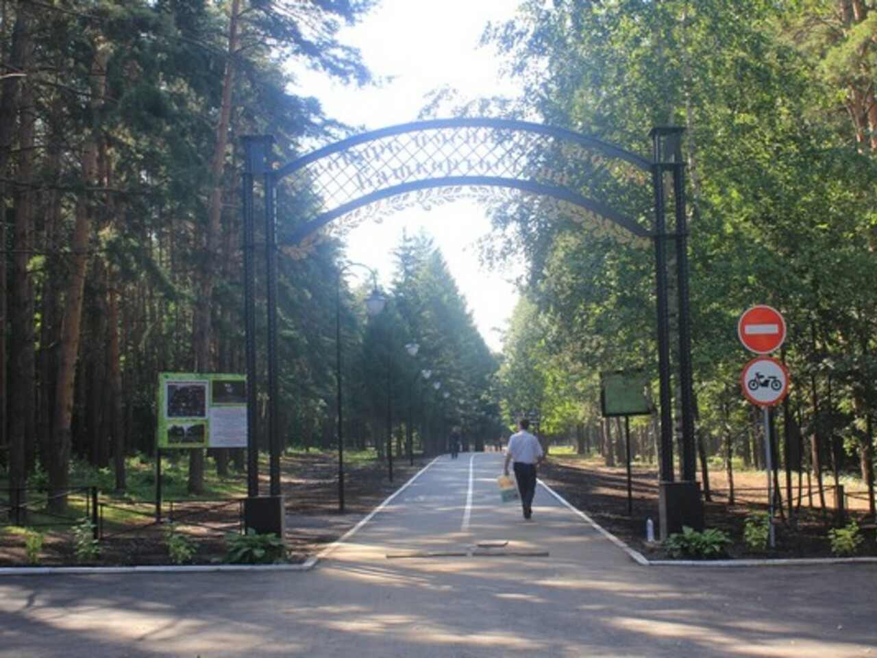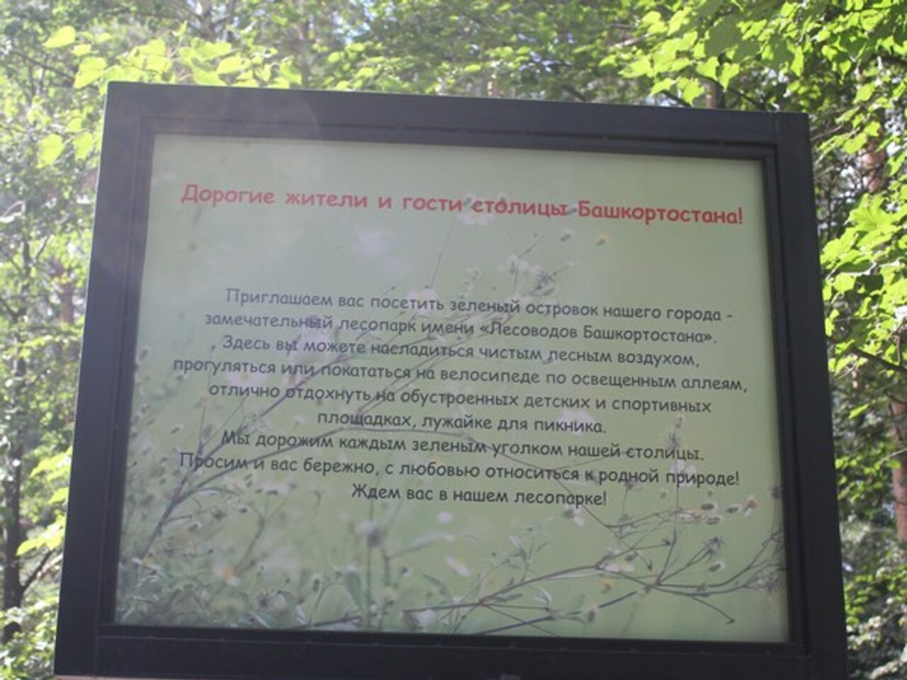 Прошли сутки. Мы тоже решили прогуляться по свежему асфальту лесопарка имени Лесоводов Башкирии. Запах сосен и пение птиц теперь приятно дополнены элементарной цивилизацией. Указатели не дают заблудиться, а раньше случайно попавший сюда человек мог потеряться всерьёз и надолго. Скамейки любезно приглашают отдохнуть.