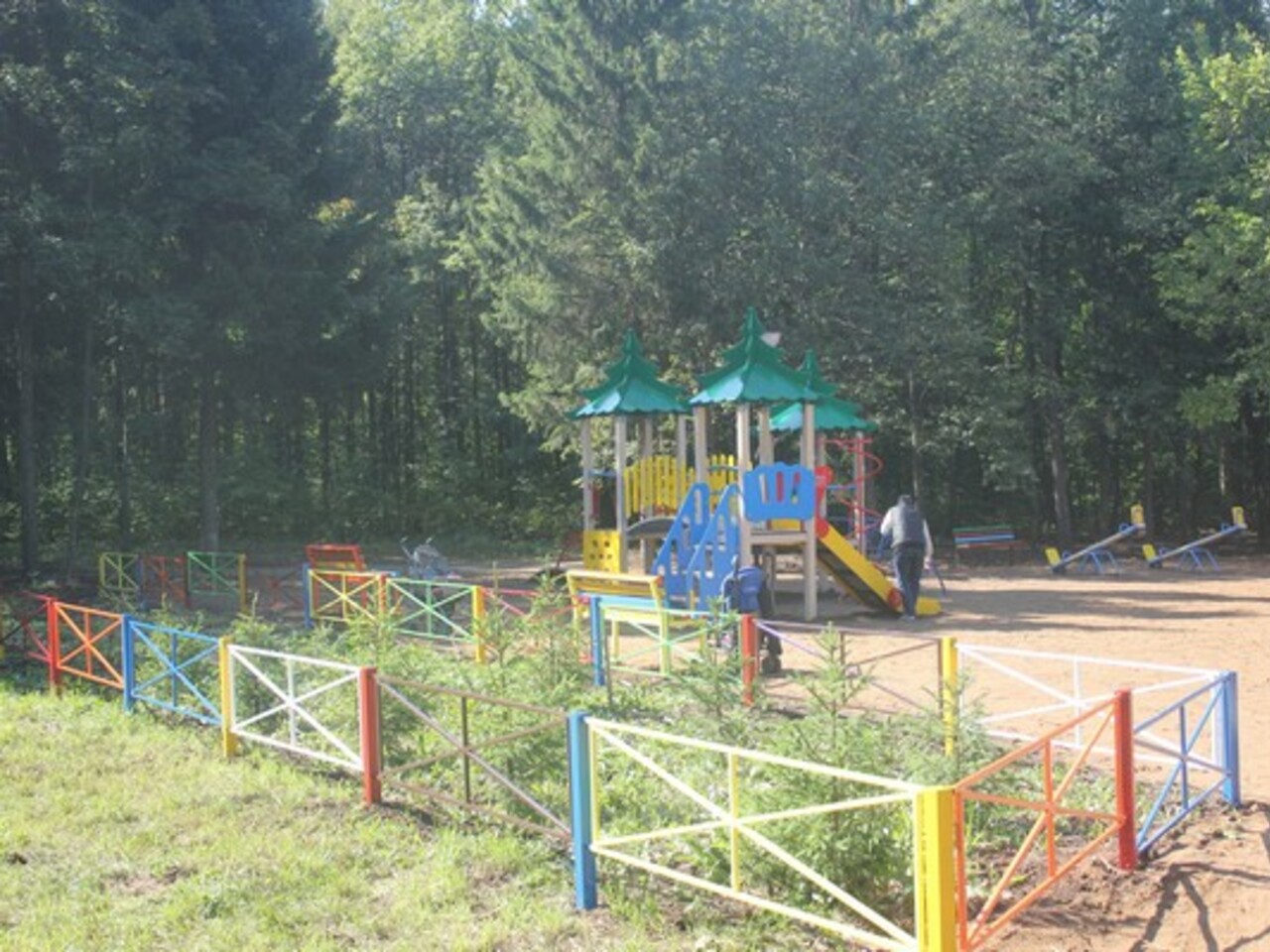 Стоят биотуалеты. Уже нет опасности увязнуть в грязи, как было ещё прошлой осенью. По дорожкам ездят велосипедисты, дети с родителями гуляют на детской площадке.