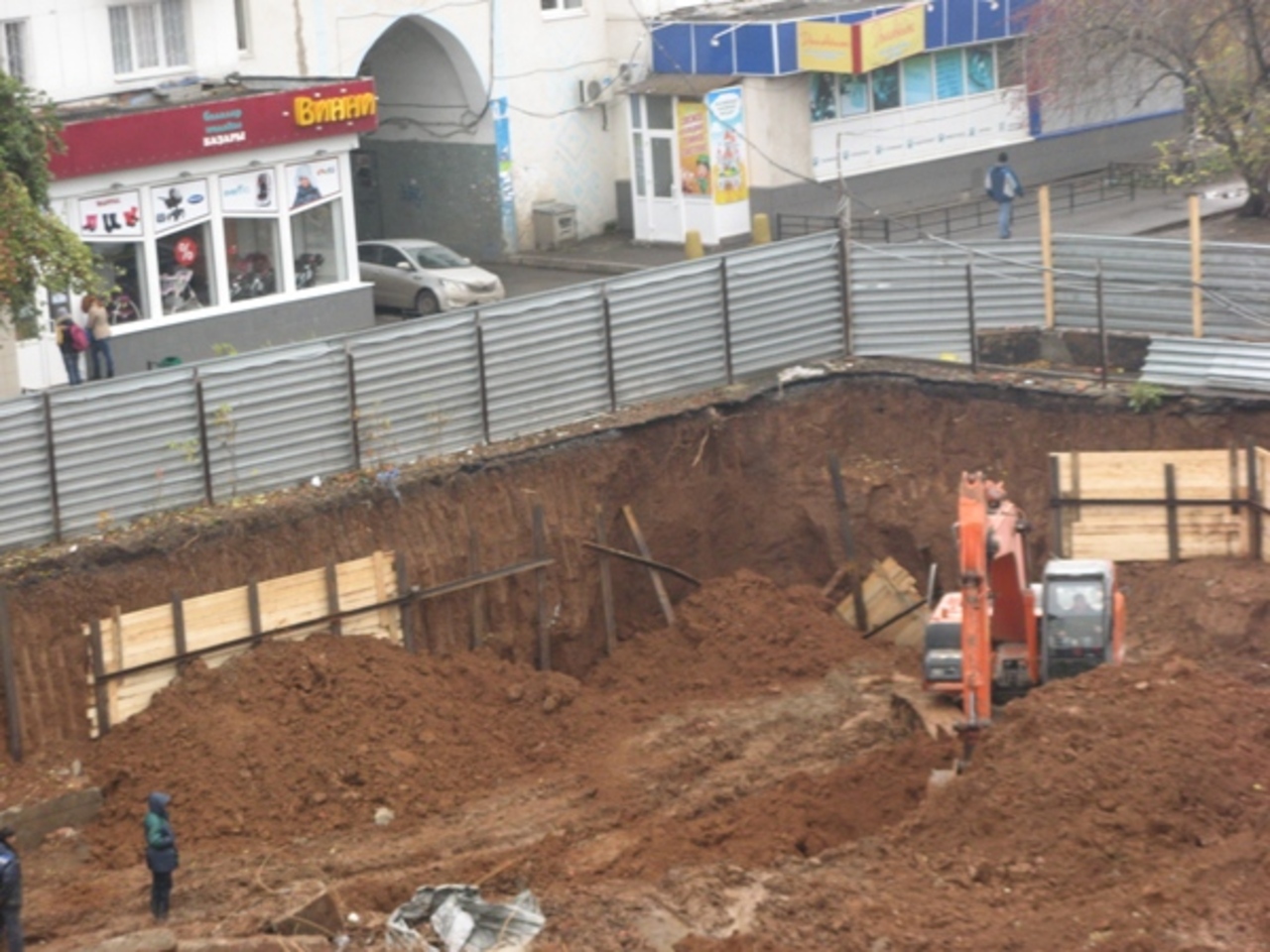 «Общественная электрогазета» решила разобраться в ситуации. Для начала мы выехали по указанному адресу и осмотрели место строительства. Как оказалось, стройка действительно ведется в непосредственной близости от жилых домов. Территория будущего торгового центра огорожена, и рассмотреть то, что творится внутри, трудно. Но если подойти поближе, сквозь прорехи забора можно увидеть, что строительные работы продолжаются, несмотря на произошедшее. Глубина котлована растет.