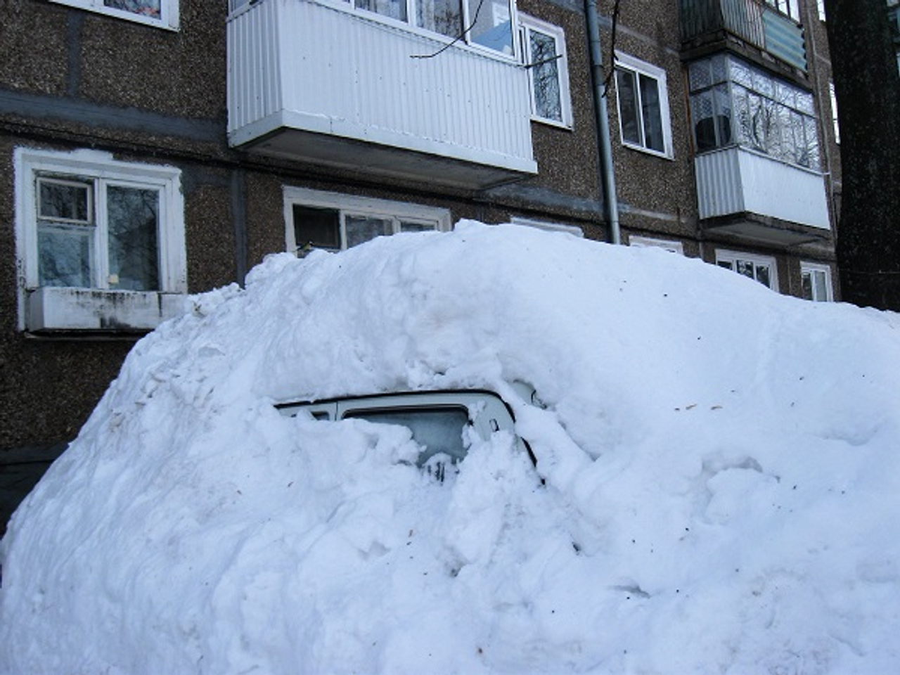 А вот хозяин припарковал машину у подъезда пятиэтажки, где обычно находится палисадник и стоят скамейки для жильцов, да, наверное, забыл о ее существовании. И если бы не краешек окошка, я бы подумала, что это обычный сугроб.