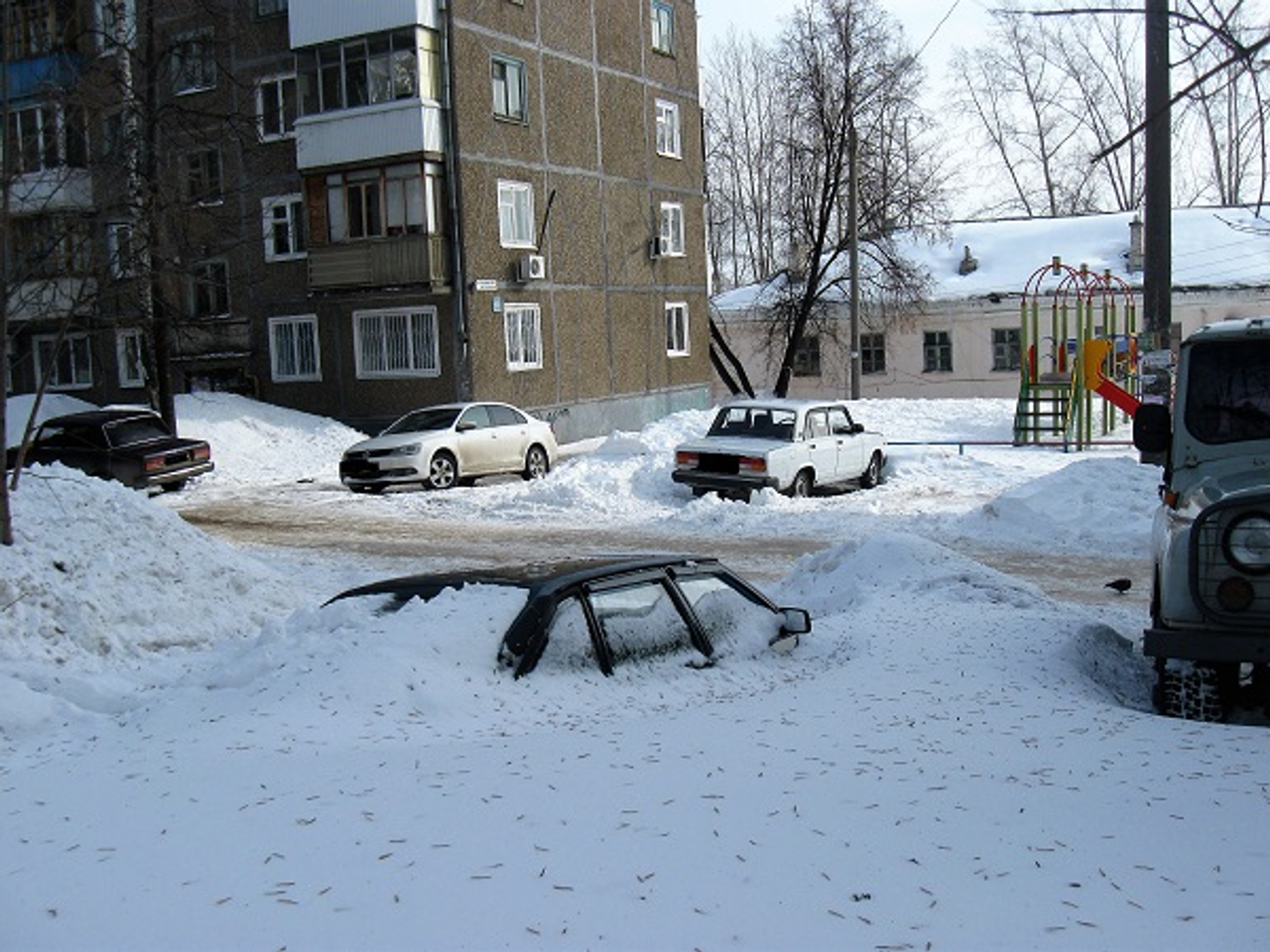Одновременно оттаивают и автомобили, брошенные хозяевами во дворах и на тротуарах. Я даже представить себе не могла, что их окажется так много. Только вблизи своего дома на улице Интернациональной я насчитала несколько автомашин, полностью погруженных в снег. Из огромных сугробов где-то проглядывает часть бампера или таблички с госномером, где-то виднеется кусочек оконного стекла. Как будто машины специально завалили снегом. Но нет, судя по плотному слою на крыше и по бокам транспортных средств, они стоят так с начала зимы. Учитывая то, что внутриквартальные проезды у нас довольно узкие, расположение машин по обочинам совсем неуместно. И ладно бы, если бы автомобили поставили ненадолго, не найдя места для парковки, а тут картина совершенно другая: транспорт за долгое время почти слился с окружающим ландшафтом.