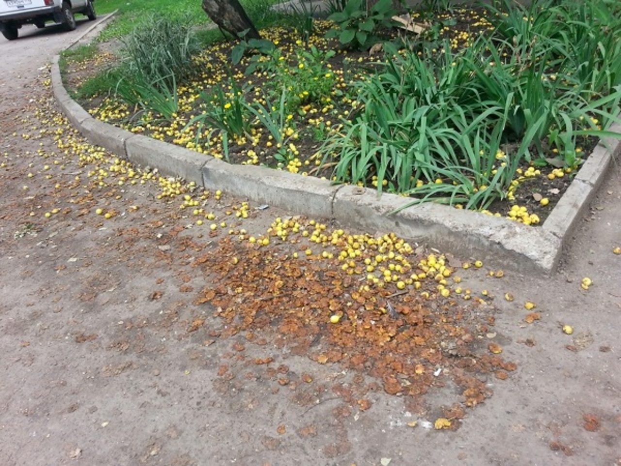 Кучки мусора то тут, то там. Окурки, полиэтиленовые пакеты, гниющие кучи яблок.