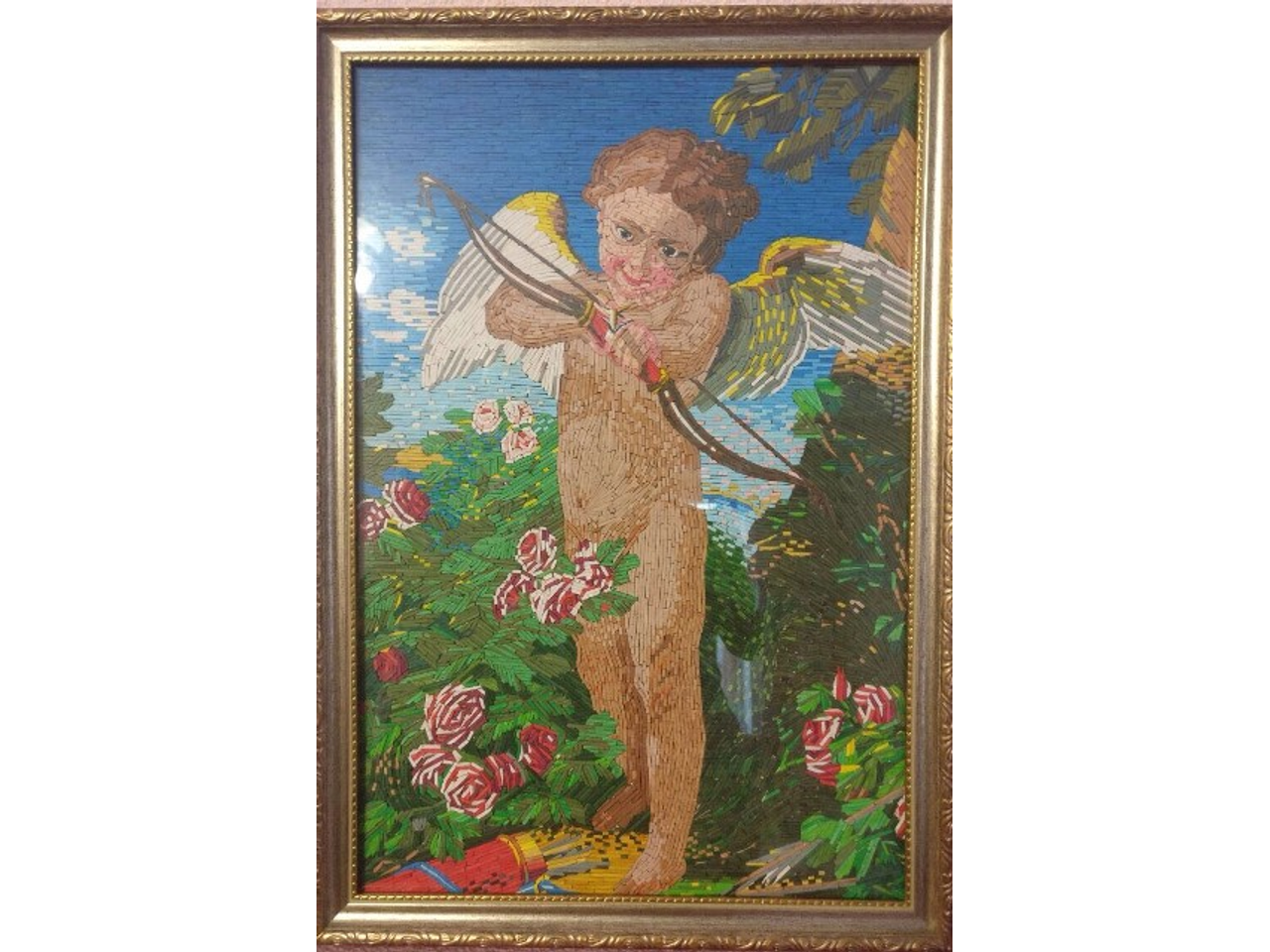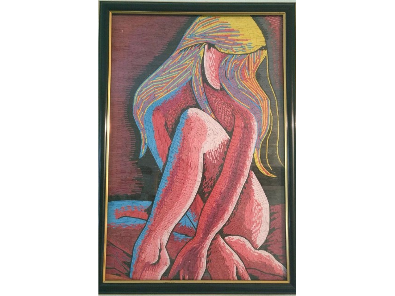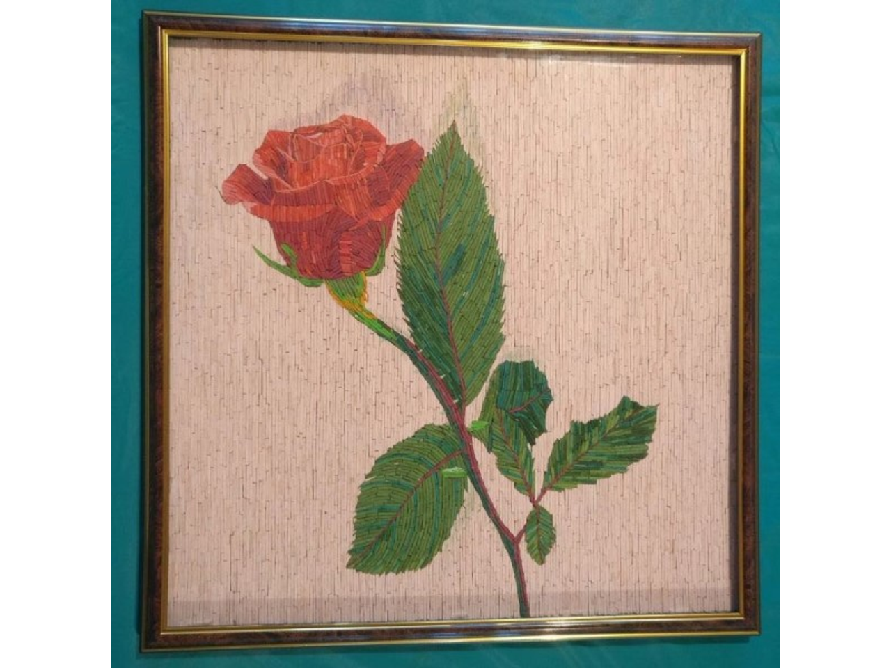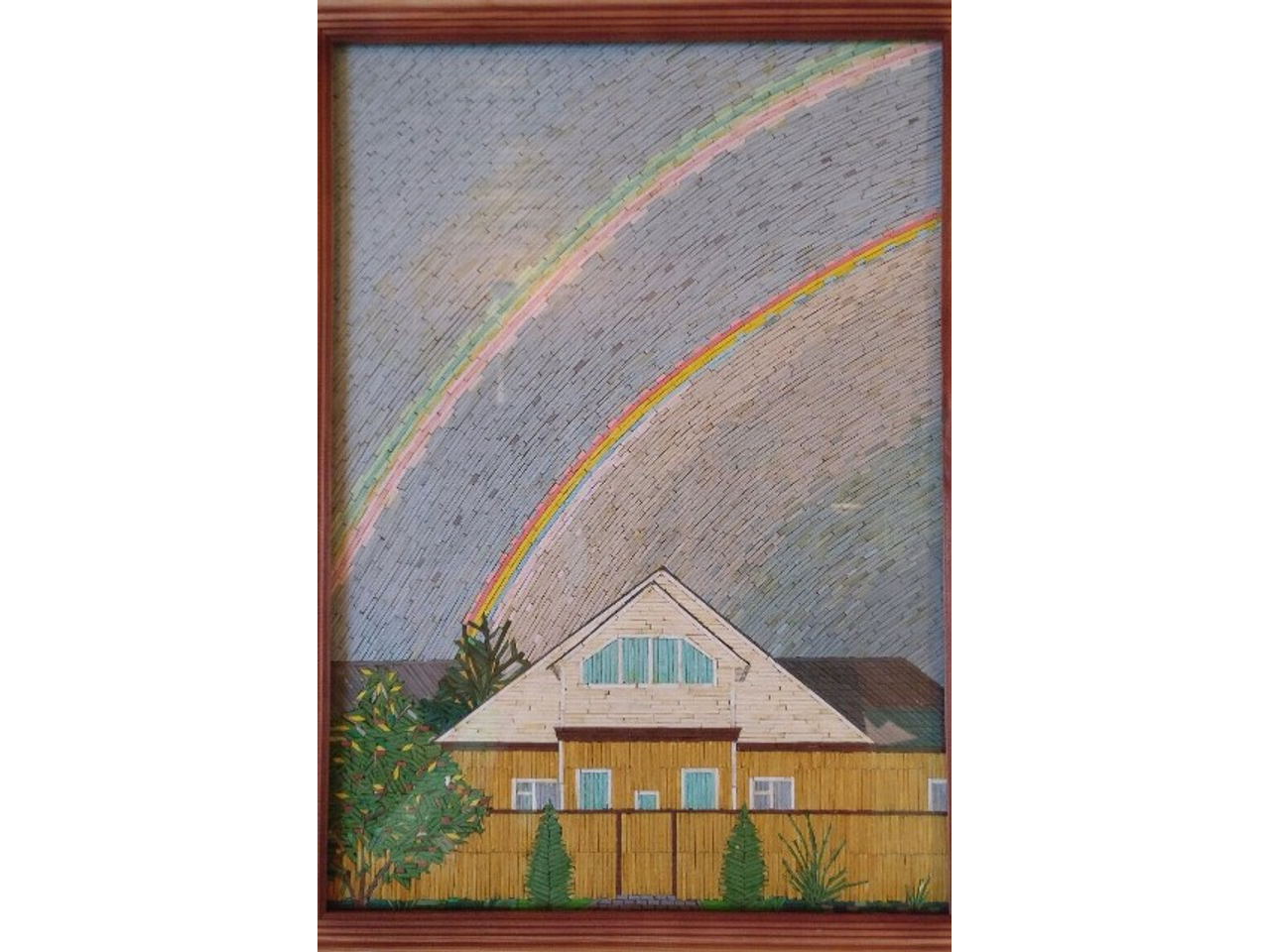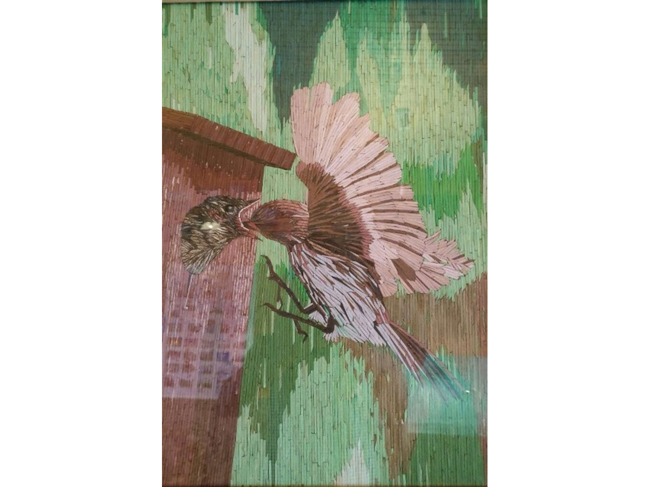 — Сначала делаю на фанере рисунок, затем определяю, какие цвета необходимы. Очищаю спички от серы. На большой тарелке готовлю колер — для этого гуашь необходимого цвета перемешиваю с клеем ПВА. Таким образом заготавливаю определенное количество спичек нужных цветов и размеров. Готовую деталь захватываю иголкой, мажу ее клеем с обратной стороны и прикрепляю на фанеру.
