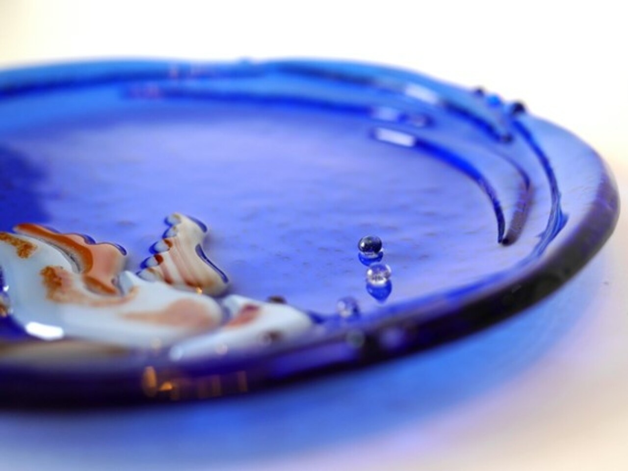 Фьюзинг — безотходное производство. Осколки, крошка, всё идёт в ход. Я могу на полку в печку насыпать кусочки оставшегося стекла, выставляю программу, они нагреваются и превращаются в капельки. Их потом можно использовать в работах — сделать носик у ёжика или зёрнышки граната. Совсем маленькие обрезки можно истолочь в пудру, насыпать её сверху на изделия, и когда она запекается, то получается эффект окрашивания.