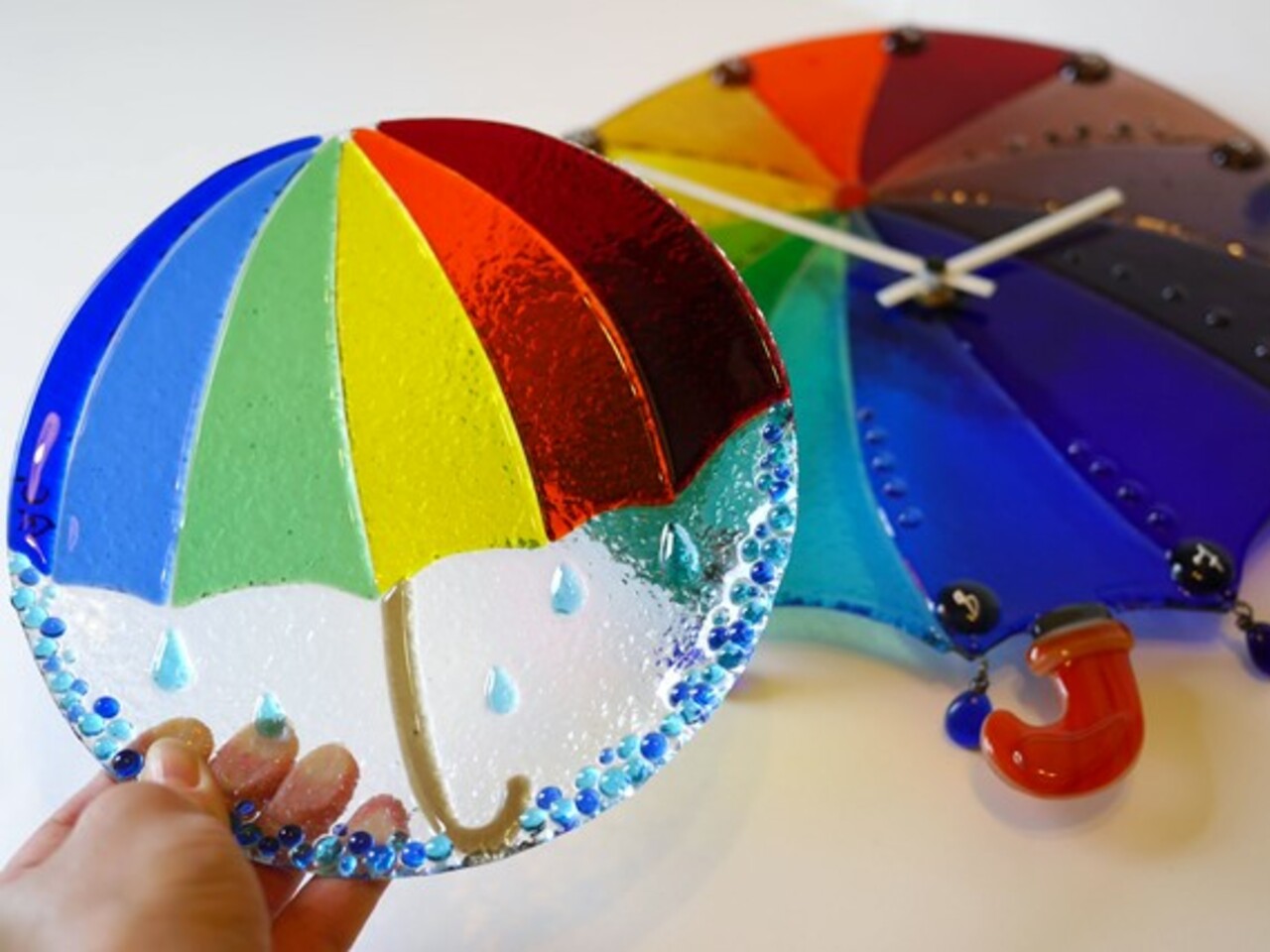 Настенные часы с зернами граната, мерцающими таинственным глубоким цветом. Милый ангелочек с пшеничными вихрами. Довольный кот, нежно прижимающий к себе сосиски. Крошечные ежики, несущие на спине спелые яблоки. Весёлые разноцветные зонтики. Всё это из стекла. И автором всей этой красоты является Элеонора Саунина.
