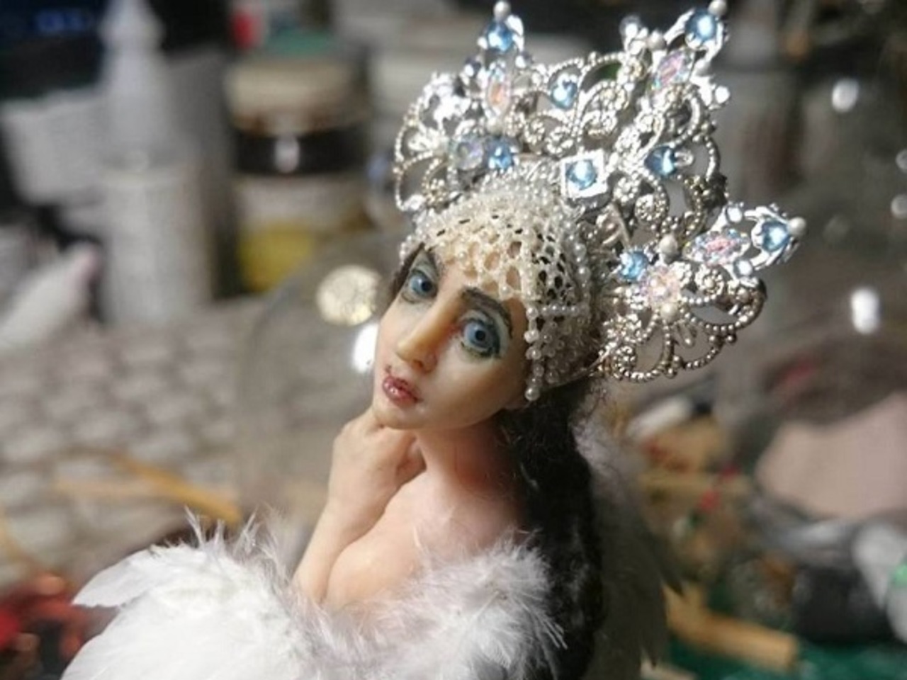 Есть и сказочные герои. Одна из них — врубелевская Царевна-лебедь. Крылья Царевны изготовлены из полимерного материала и покрыты рядами лебяжьих перышек, а кокошник — спаян из кусочков филиграни.