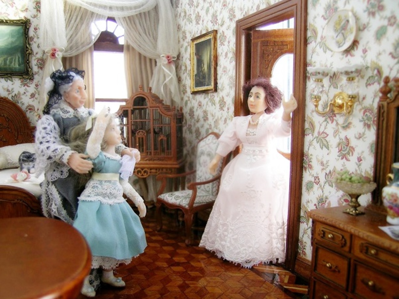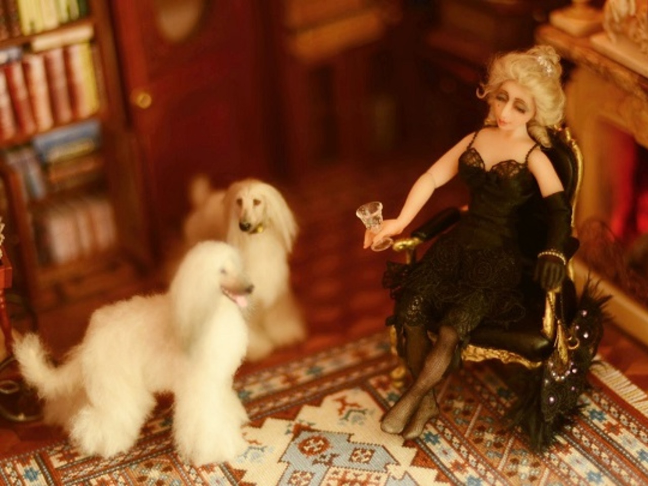 — Самое важное в работе — четко передать то, что уже возникло у тебя в голове. Материалом служит запекаемая полимерная масса. Фигурки делаются в масштабе 1:12, высота куклы — не более 13-14 сантиметров, а одежду для них я делаю из ткани, кружев и кожи. На одну куклу, как правило, уходит около трех дней. А вот интерьеры делаются месяцами.