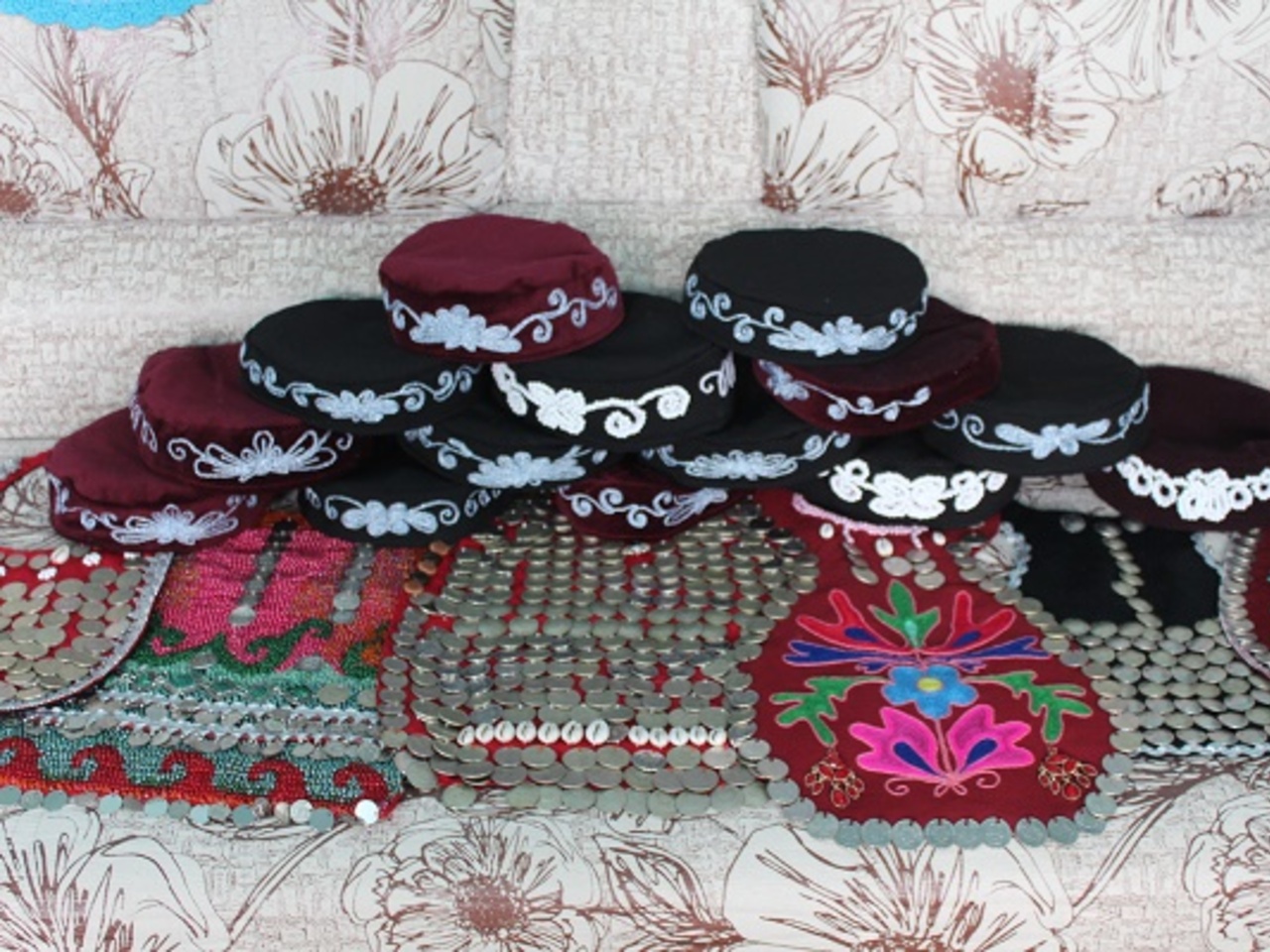 Головные уборы девушек и женщин калпак (ҡалпаҡ), сдвоенные платки (ҡушъяулыҡ) также является объектом рукоделия мастерицы. Первые она шьет из бархата или из карпета и украшает вышивкой, бисером.