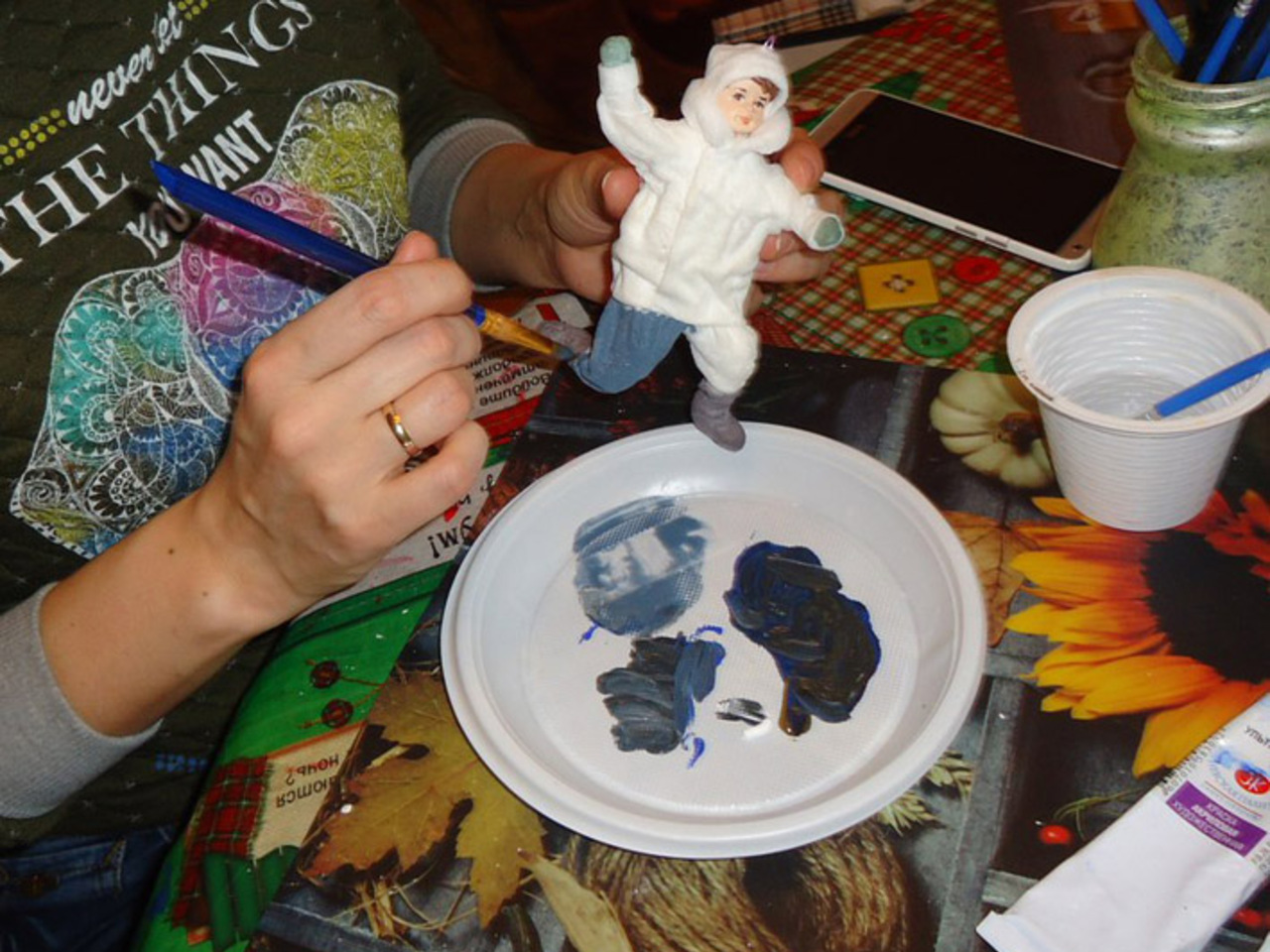 Сначала я сама делаю нужную пресс-форму, на которой из керамопластики выдавливается лицевая деталь, после сушки закрепляемая на изделии клеем. Когда фигурка готова, наступает очень ответственный этап раскраски и тонировки. Я предпочитаю водорастворимые художественные акриловые краски, хотя альтернативой может быть и акварель».