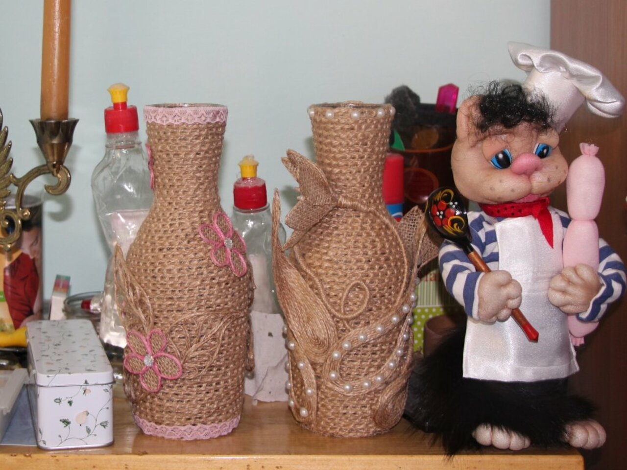 — Это Альбина Габдульманова. Нина Миронова, Валентина Мухтасипова, Фарида Камильянова, Надежда Плешкова. Сейчас кружковую работу с ними больше ведёт Наталья Владимировна Данилова. Мне очень нравится, что у нас в коллективе очень дружелюбная, товарищеская атмосфера. Если у кого-то, к примеру, нечем украсить готовое изделие, то другие тут же наперебой предлагают — а у меня вот это есть, возьми, а у меня вот такое есть. У нас же не город, в магазин не пойдешь, не купишь. Те, которые не первый год занимаются, уже смеются над собой, говорят: «Мы такими крохоборами стали, всё собираем — отрезочки, шкатулочки, бутылочки. Всё в чуланах хранится. Даже сами уже не помним, что там лежит, но лежит, потому что может пригодиться». Если кто-то едет в город, то заказы берёт, для других покупает — ткань, синтепон или ещё что-то. И делимся друг с другом постоянно.