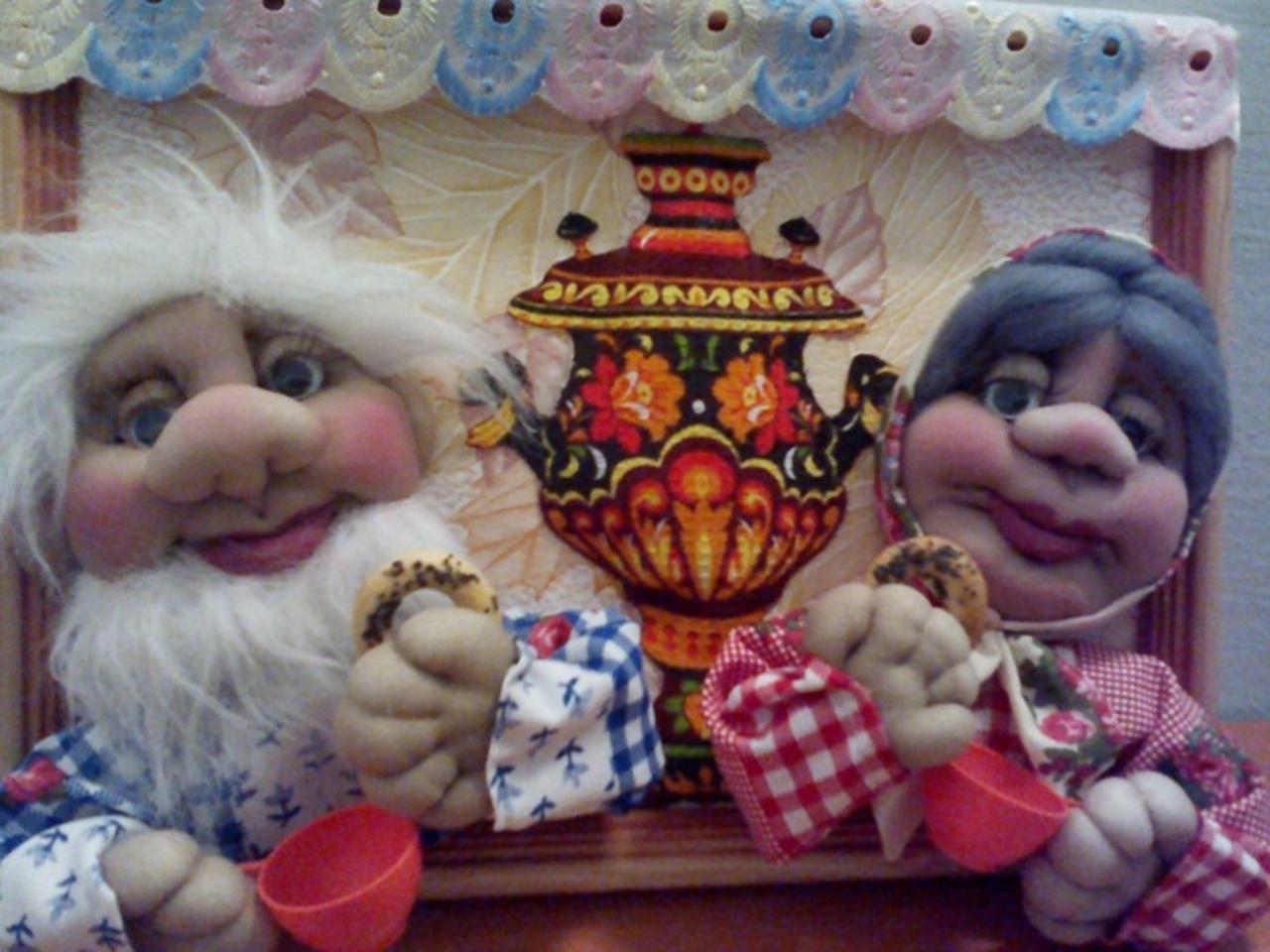 — До того, как переехать в Красный Ключ, я работала в детском саду в Уфе. И мы там все плели макраме. Соревновались — в какой группе панно красивее будет. И когда я приехала в село, я продолжила этим заниматься. Потом года четыре лепила картины из солёного теста. Тогда ещё интернета не было. Я брала детские журналы и лепила персонажей, которые мне нравились. Как лучше сделать — самостоятельно придумывала. С интернетом всё стало намного проще — там и технология показана, и все подробности расписаны, и мастер-классы сейчас проводятся. Потом мне знакомая сказала, что нашла в интернете куклы из колготок. И я решила попробовать. Берём колготки, набиваем их синтепоном. Отдельно сначала делаем голову. Затем туловище, его делать уже довольно просто. Наталья Владимировна предпочитает колготкам носки или мягкий трикотаж.