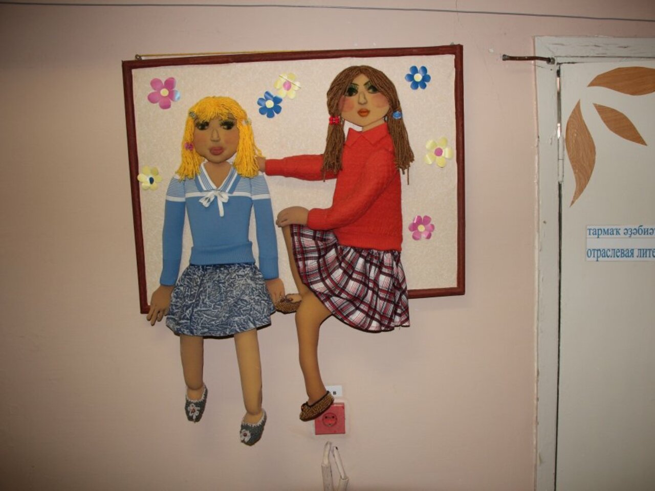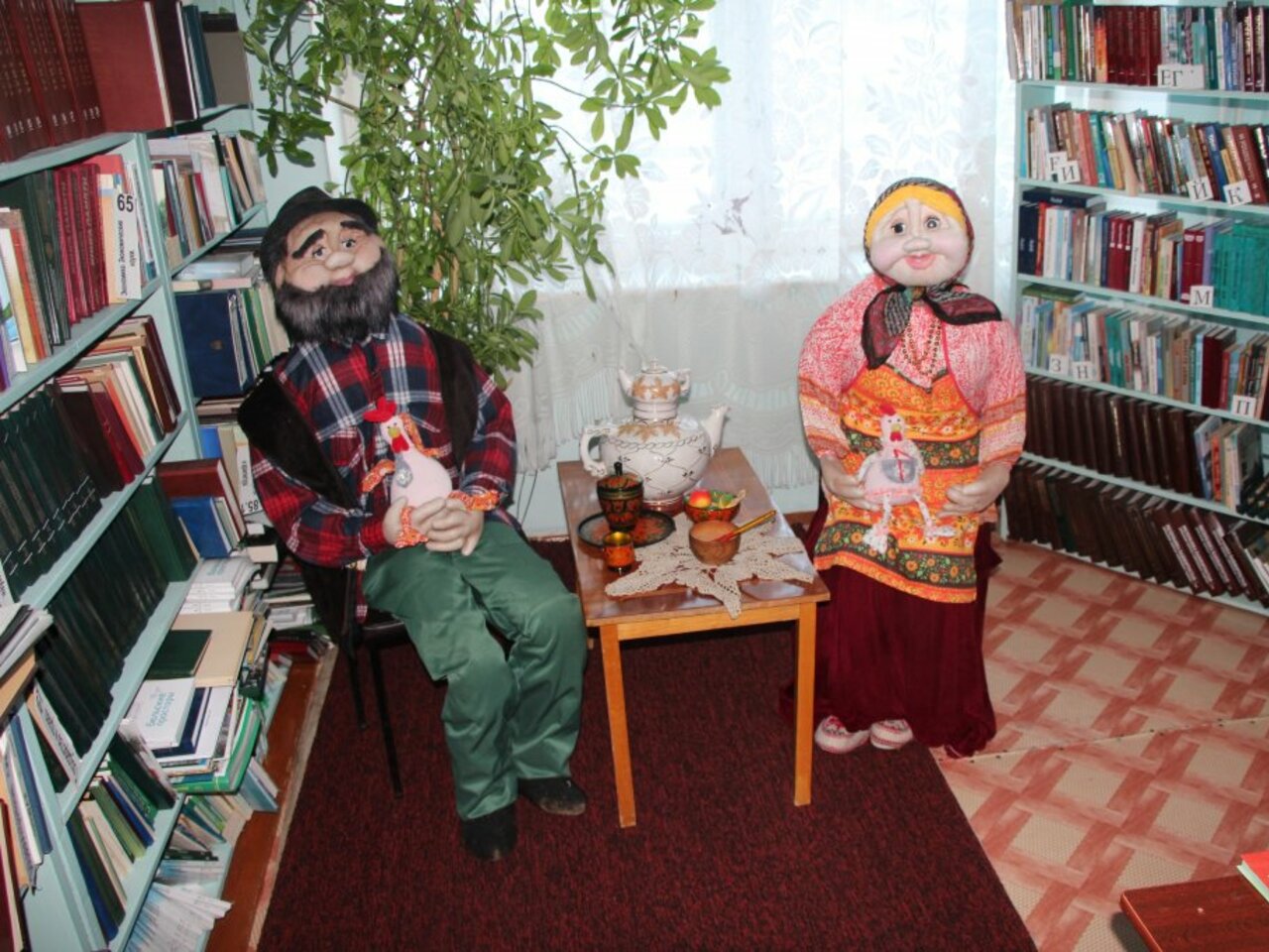 — Ростовые куклы я начала делать, потому что из райцентра поступил заказ. По заказу мы сделали парня и девушку. Основа этих кукол — устойчивый деревянный каркас, поэтому они могут стоять и присутствуют на разных мероприятиях. Переодеваем их постоянно — то в национальные одежды, то в военную форму, то в другие наряды, в зависимости от необходимости. А потом для библиотеки мы сделали ещё бабушку и дедушку — они сидят у нас за столом, чай пьют. Они очень лёгкие, без каркаса, туловище сделано из пятилитровых пластиковых бутылок. Их тоже просят на всякие праздники.
