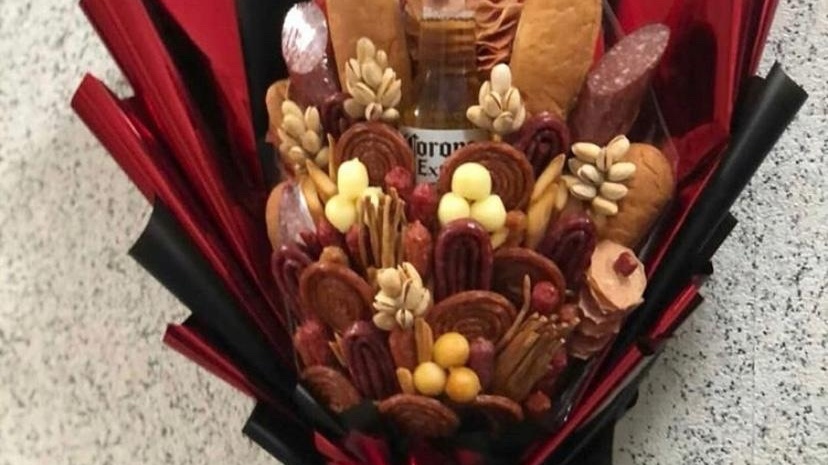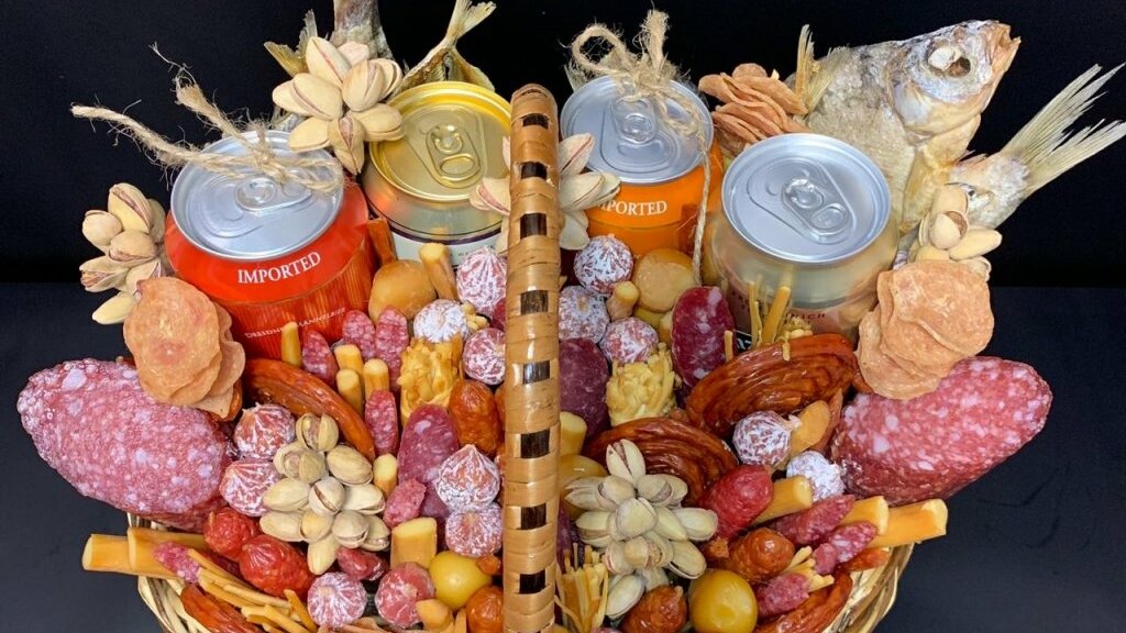 — В основном сырные, колбасные, пивные. Для их изготовления используются высококачественные элитные сорта колбас и сыров. Еще включаем в букеты рыбу, упаковки чипсов, сухариков, кофе в баночках, мёд, алкогольные напитки, орехи.
