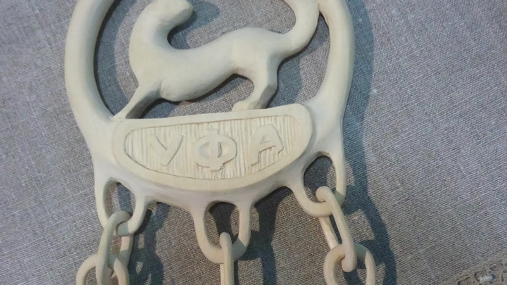 Ребята под руководством Владимира Савельева изучают региональные особенности нашей местности. Например, среди работ есть куница с герба Уфы, сделанная в традициях узорной резьбы по дереву, с кольцами и с подвесками. Причем сделана она из цельного куска дерева.
