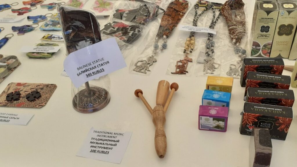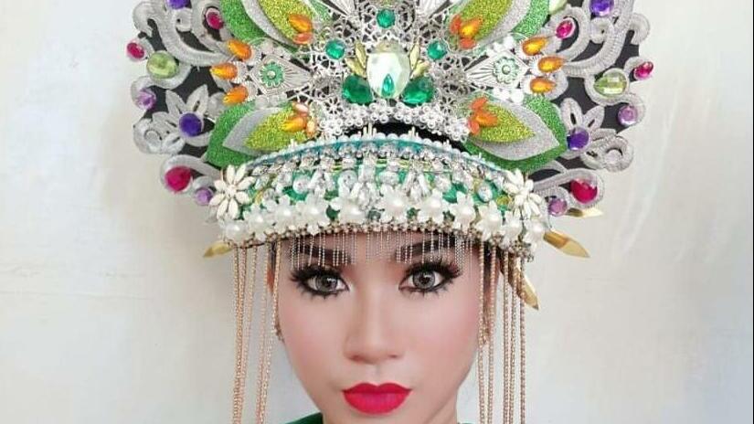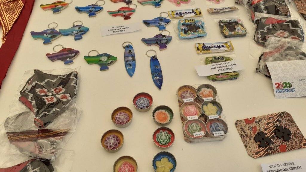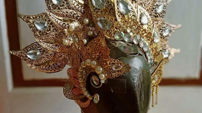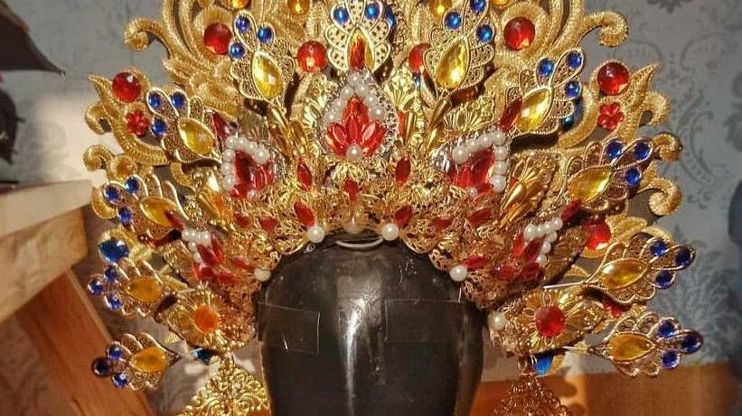 Участник танцевального коллектива из Индонезии Ирия Йофан Анггара во время фольклориады в Уфе распродал почти все головные уборы, сделанные своими руками. Поэтому на выставке удалось сфотографировать лишь одно его изделие. На фото — балийский головной убор.