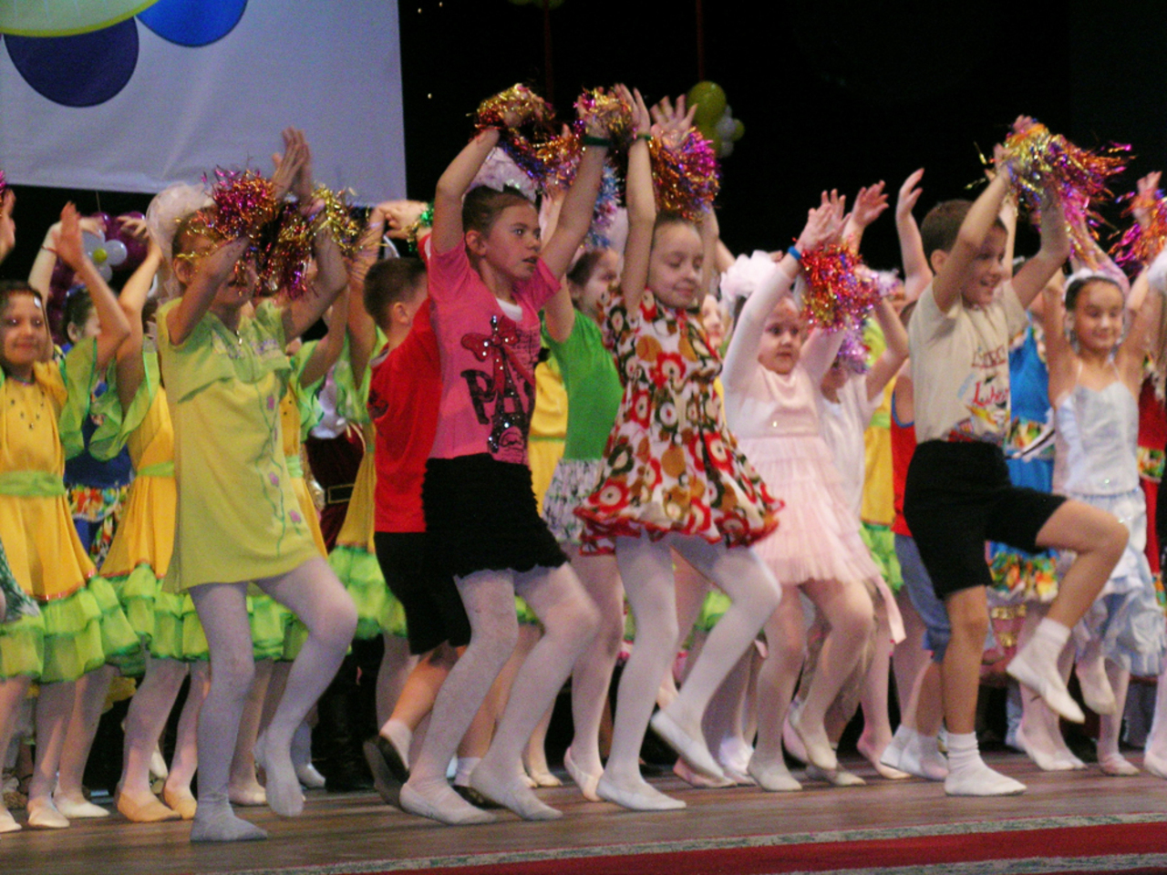 …Шум, гам, тарарам! Сцене приходится выдерживать натиск башмачков деток-конфеток в разноцветных нарядах-обёртках. На мониторе надпись – «Воробьиная дискотека». Вот, оказывается, куда мы попали. Таких весёлых воробышков мы давненько не видели!