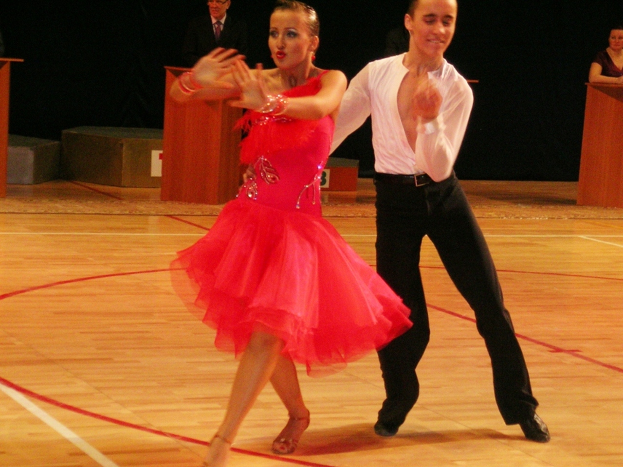 Первенство ПФО. Категория «Молодёжь». 10 танцев – пожалуй, самая крутая программа турнира. Финалы. Все трудности – за кадром, а на паркете мы видим игру равновесия, иллюзию парения. Вальс, фокстрот, квикстеп… Самба, румба, пасодобль… Танцпол превращается в модный подиум. Невозможно отвести глаз от роскошного алого наряда Кати Черкасовой, от буквально невесомого платья Даши Жуковой. Пальму первенства отдаём платью Юлии Чубраковой. А жюри отдаёт первое место танцевальному дуэту из клуба «Весна» Юлии Чубраковой и Никите Губайдуллину. Даша Жукова и Женя Берляков из «Телемарка» удостоились «серебра». Кате Черкасовой и Тагиру Вафину из «Созвездия» на сей раз не удалось намыть золото – каблучки их туфелек стали только бронзовыми.