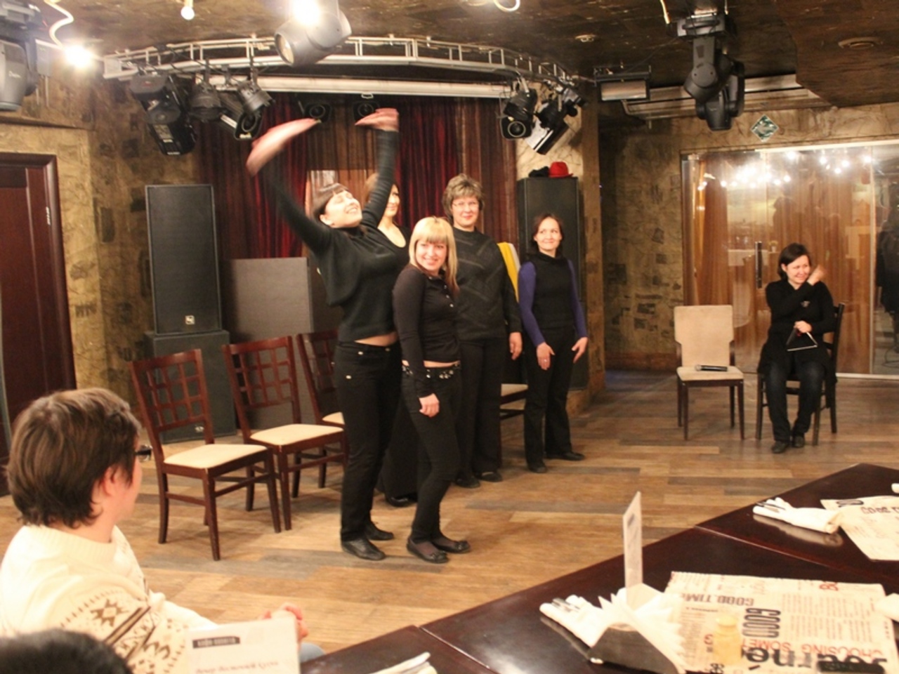 Итак, в кафе собралось около тридцати человек, жаждущих нового зрелища. На свободной площадке перед зрителями расположились четыре актера. Вернее, актрисы. Режиссер Екатерина Муталапова предложила желающим рассказать свою историю. Повисла долгая пауза. Поначалу никто не решался выйти к микрофону. Но вот, наконец, появился смельчак – молодой парень. Он взял в руки микрофон и рассказал какую-то забавную историю. Уже даже не помню о чем. И – о чудо! Актеры моментально и спонтанно изобразили эту незатейливую байку, используя пластику своего тела. Играли они, ни о чем не договариваясь заранее, но понимая друг друга без слов. И это было потрясающе! Зрители постепенно осмелели и стали рассказывать свои истории одну за другой. Это были истории то грустные и даже порой трагические, то забавные и смешные. А я. например, прочла свое последнее стихотворение и попросила сыграть по нему мини-спектакль. И актрисы великолепно справились с этим заданием. Я увидела наяву, зрительно тот образ, который пыталась передать в звуке и в слове.