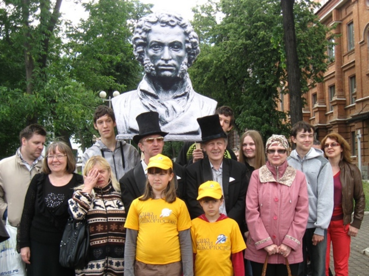 Участники пушкинского праздника во главе с председателем Объединения русских писателей РБ, главным редактором журнала «Бельские просторы» Юрием Горюхиным решили «восстановить справедливость». Заранее заготовленный макет бюста (почти точная копия настоящего) был торжественно доставлен к театру оперы и балета, где некогда он и стоял. По дороге все благодарили краеведа и журналиста Анатолия Чечуху, изготовившего это рукотворное чудо. А затем «на фоне Пушкина снималось семейство» (думаю, Булат Окуджава не обиделся бы на эту немного измененную цитату). Уточняю: семейство любителей поэзии и поклонников творчества выдающегося классика русской литературы.