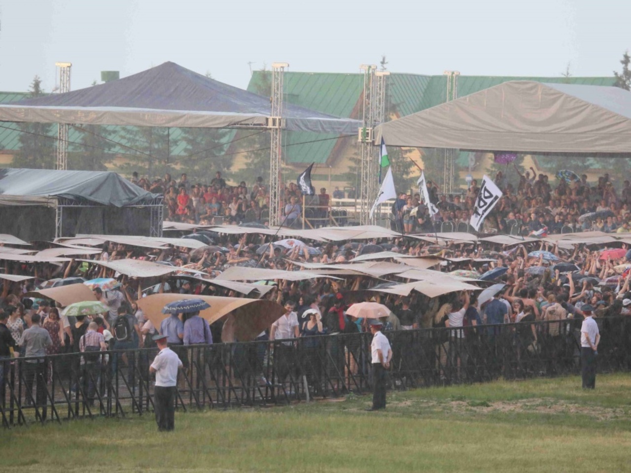 Весь ипподром мгновенно покрылся листами ДВП — находчивые уфимцы разобрали покрытие и соорудили себе домики.