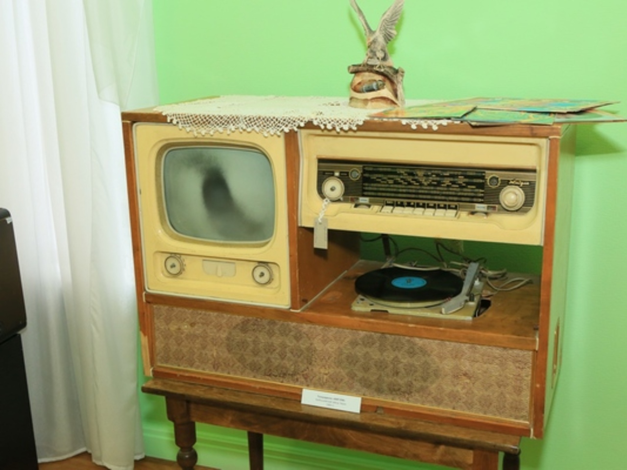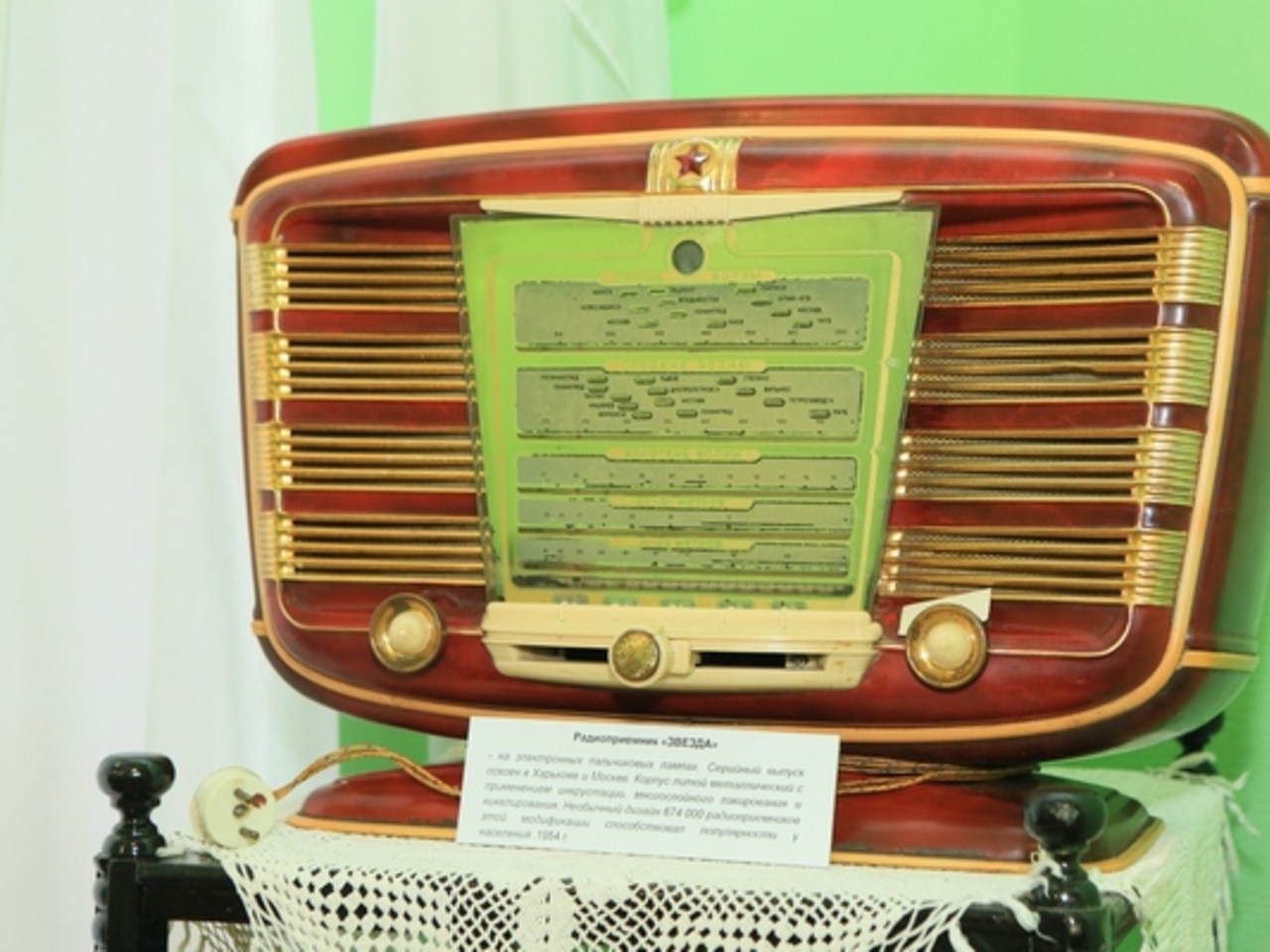 Ещё один любопытный экспонат — приёмник представительского класса «Звезда» 1954 года. Всего было выпущено чуть более 670 тысяч экземпляров. Дизайн нашей «Звезды» скопирован с французского радиоприёмника, который в 1952 годы был подарен советским дипломатам.