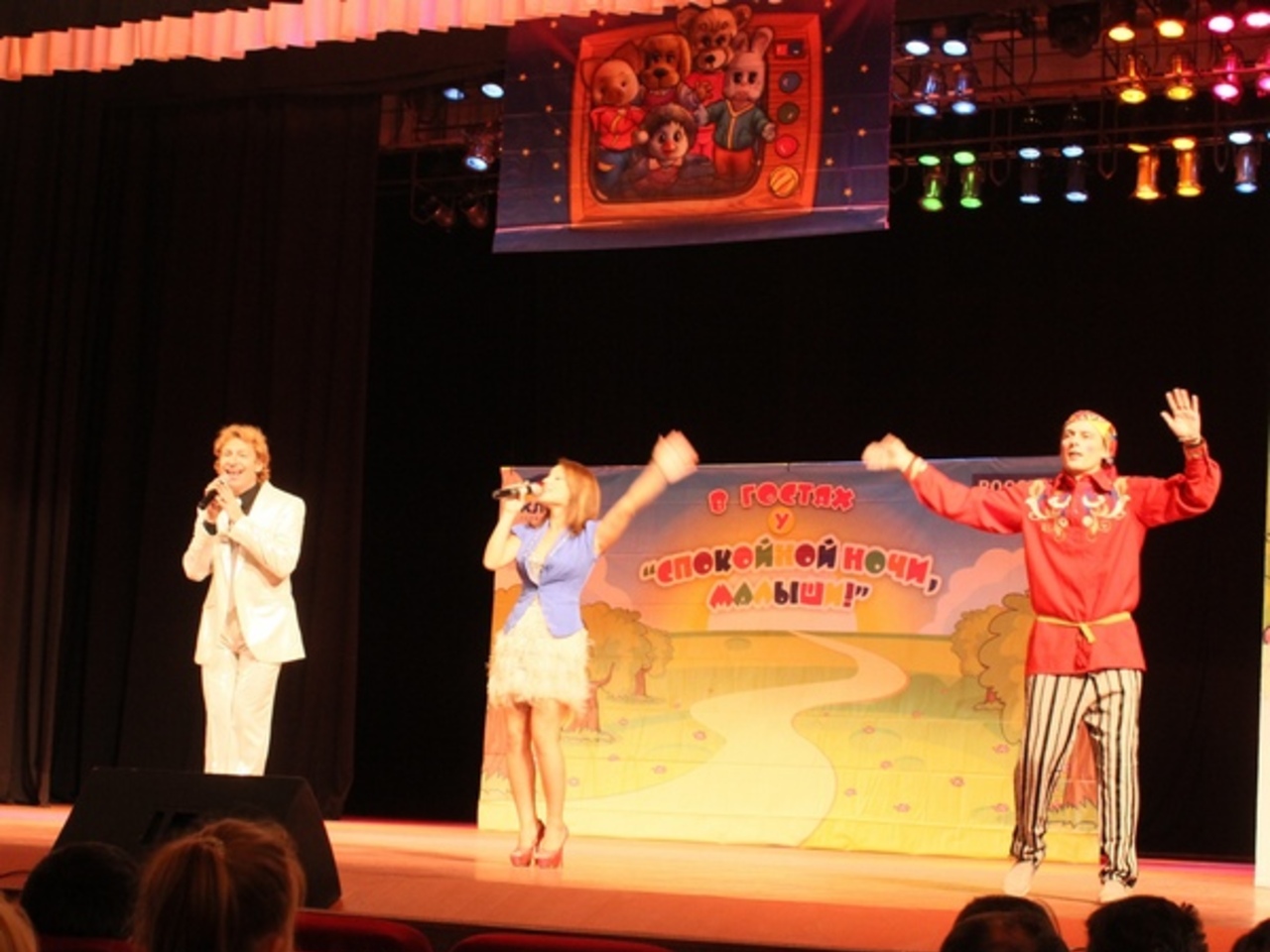 — Поскольку этот год юбилейный, то команда передачи с гастрольным туром решила объехать всю Россию, — рассказывает генеральный директор ТРК «Класс» Людмила Зайцева, — мы побывали не только в таких крупных городах, как Владивосток или Уфа, но и в маленьких областных. Везде наших героев тепло принимают и рады видеть воочию. «Спокойной ночи, малыши!» — камерная, уютная, домашняя передача, — говорит руководитель детской телерадиокомпании. — Поэтому в праздничном представлении на большой сцене попытались соединить кукольных персонажей передачи с компактной гастрольной эстрадной группой.