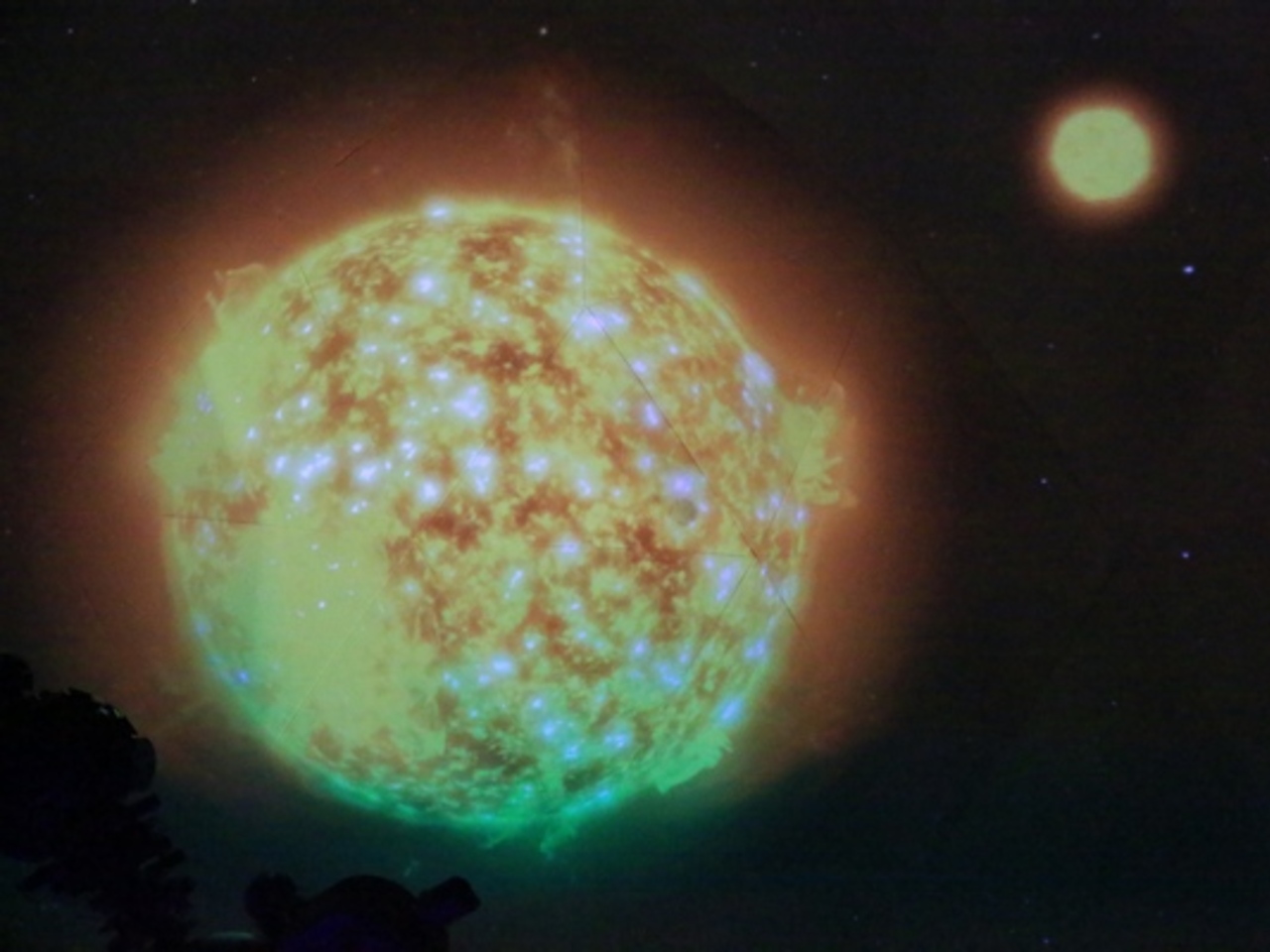 С точки зрения идеологии новое оборудование — новый шаг в современном кино. Это достаточно дорогая технология, называется она «полнокупольная многопроекторная система». По сути, это мечта всех планетариев. Интеллектуальное программное обеспечение нажатием одной кнопки сводит в одно целое изображение из четырех новых видеопроекторов, установленных по периметру купола. В результате над зрителем разворачивается объемная динамичная картина, эффект можно сравнить с 3D без очков. Речь идет о настоящем сферическом кино. При этом нет границ экрана — зритель сидит под куполом, и таким образом, может видеть картинку над собой и вокруг себя, становясь «участником» событий. Конечно же, используется компьютерная графика, в результате чего познавательные программы становятся еще ярче и динамичнее.