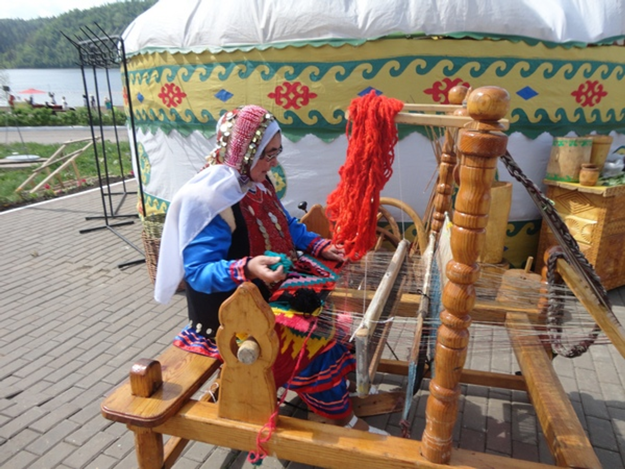 Весь день под палящим солнцем в ярких национальных костюмах они от души выступали, угощали и создавали настроение, которого так не хватало угрюмым отдыхающим. Около юрты симпатичная бабушка на станке ткала кейеҙ — узорчатый палас из войлока.