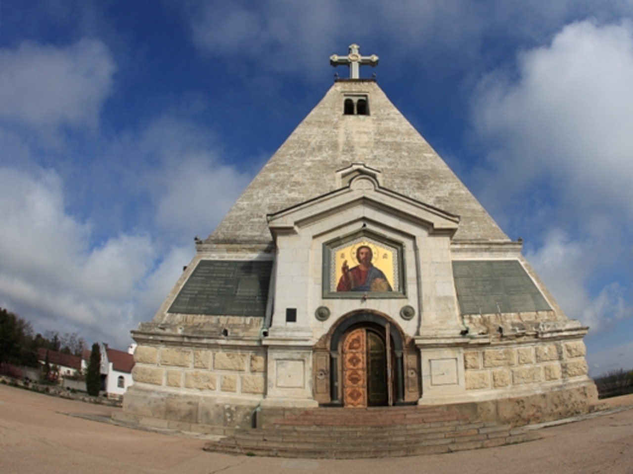 На одном из фото — Свято-Никольский храм в Севастополе. Эта православная церковь, прежде всего, поражает своей необычной архитектурой — построена в форме пирамиды, которую венчает многотонный каменный крест.