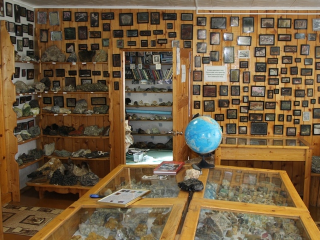 Коллекция занимает большую комнату, вдоль стен и посередине стоят стеллажи с россыпями драгоценностей. Все, как и положено, классифицировано: окислы, карбонаты и т.д. По стенам же висит великое множество картинок из камня в базальтовом обрамлении.