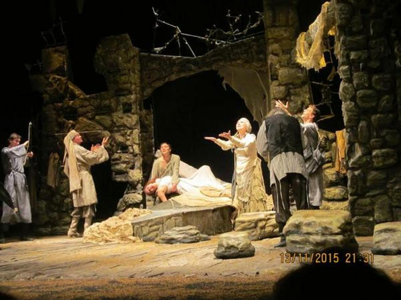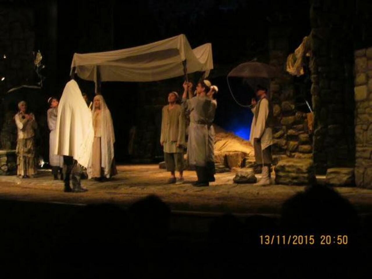 Сценография решена, в основном, в духе библейских аллюзий: каменная кладка стен ассоциируется с разрушенным Храмом, создает ощущение холода и не отвлекает зрителей деталями. Сверху сыплется песок, песок времени, (а, может, манна небесная?), собираемый в зонты как благодать Всевышнего.