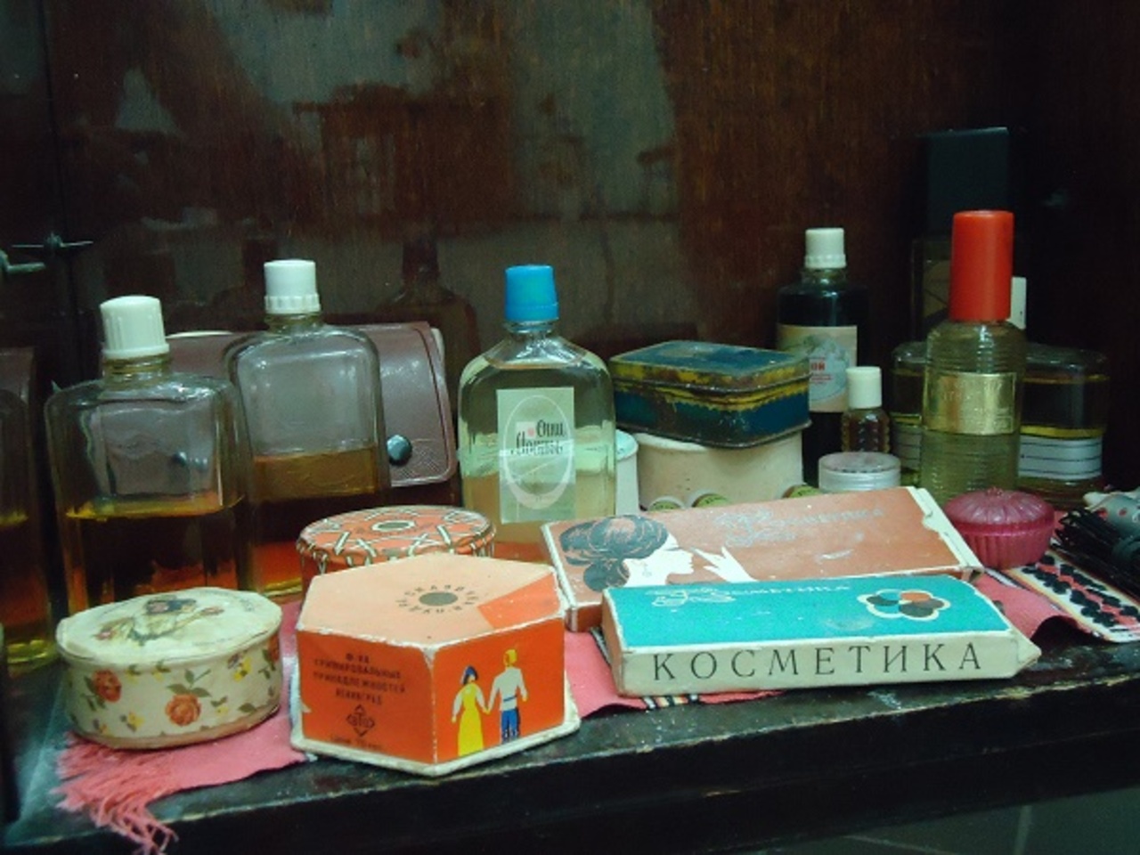Рядом с ним — знаменитые духи «Огни Москвы», тушь для ресниц, пудра и бигуди. Все из Советского Союза.
