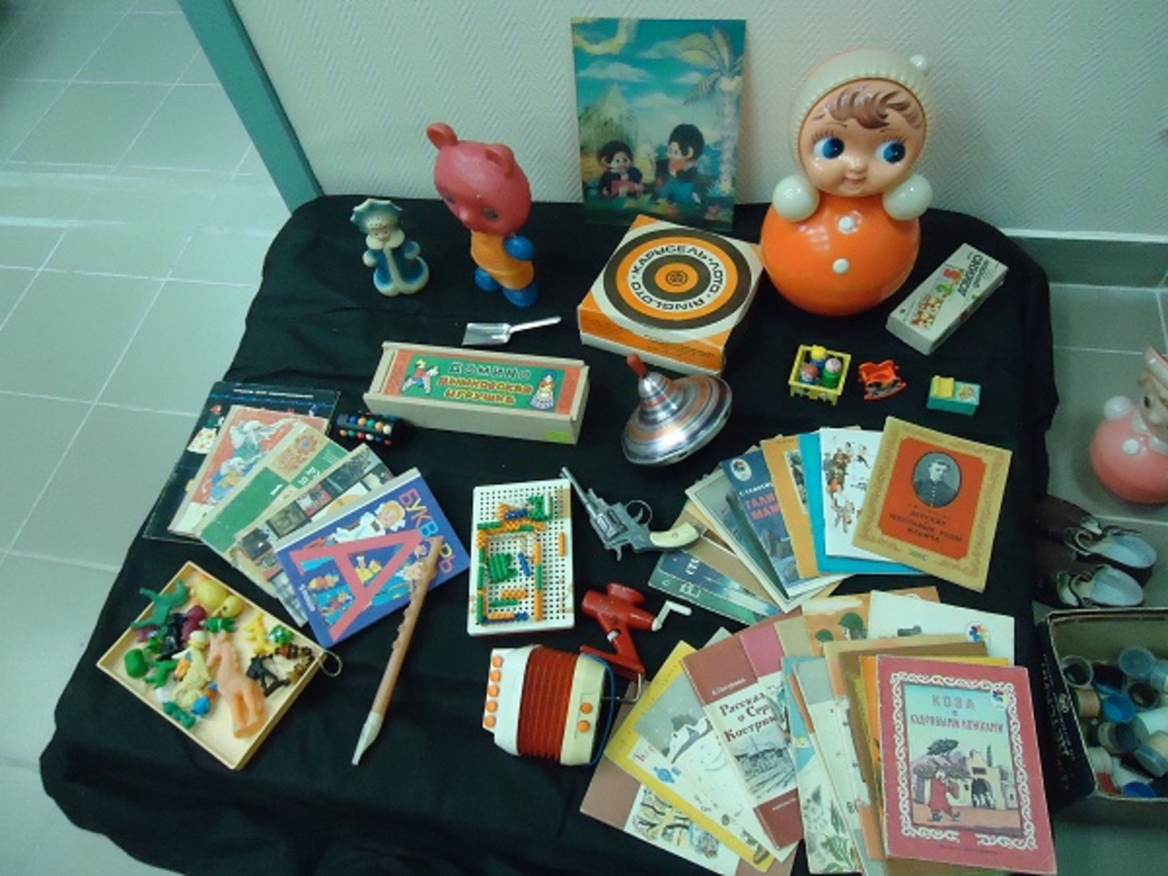 Детская зона состоит из образцов советских учебников, книжек для детей и игрушек.