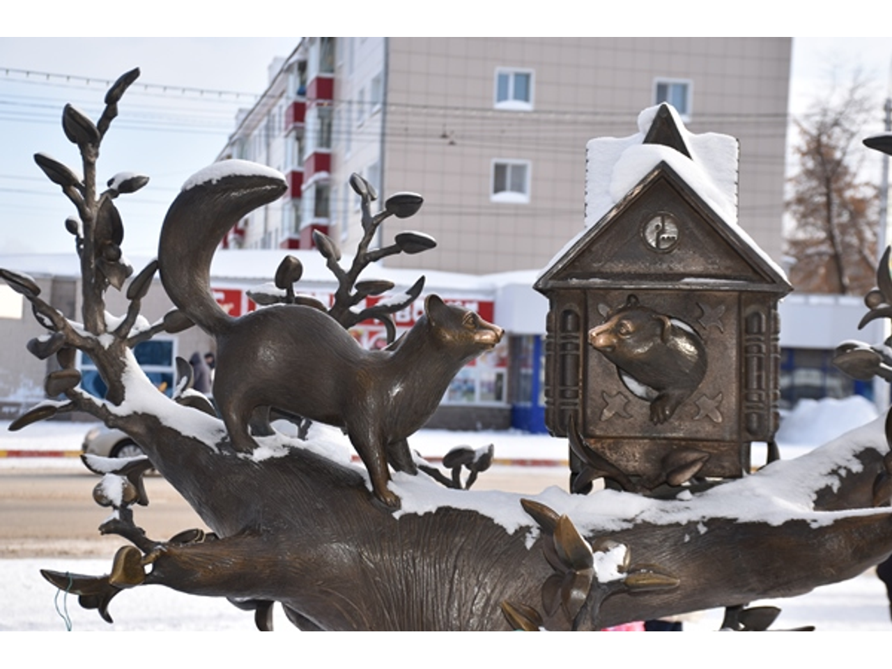 Из Гостиного двора мы поехали в парк Якутова. Там нам предстояло найти подсказку на памятнике куницам, который в народе прозвали: «Где зарплата?». Найти подсказку оказалось несложно — бумажка с кодом была прицеплена к памятнику с помощью зеленой резинки для денег.