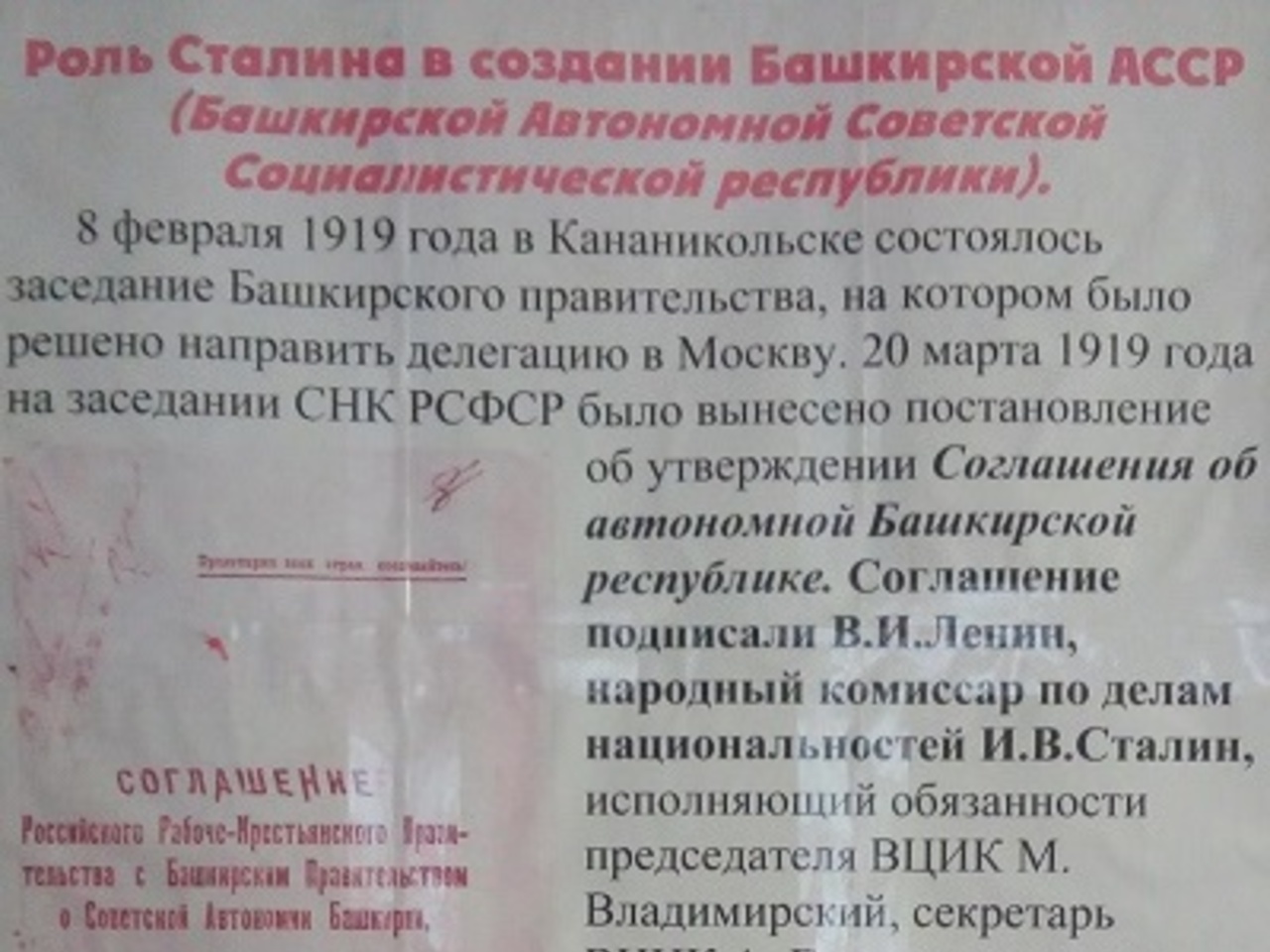 — Музей основали комсомольцы Уфы. Да, сейчас в нашем городе есть и комсомольская, и пионерская организации. Комсомольцы открыли музей в декабре, в день рождения Сталина. С именем Сталина связано образование Башкирии. Именно он, как народный комиссар по делам национальностей, подписал в 1919 году указ о создании нашей республики.