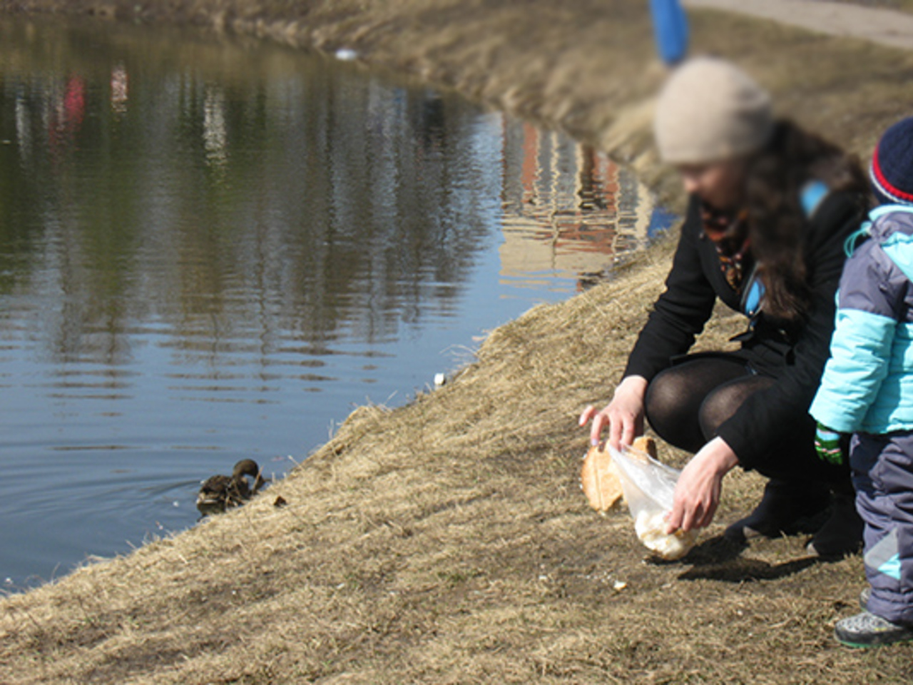 Что бы там ни было, но людей они не боятся. Мамы и бабушки с детьми подходят к самому краю пруда и кидают в воду куски хлеба. Утки подплывают и, быстро насыщаясь, скользят в другую сторону, где их что-то заинтересовало. Иногда выходят на берег.