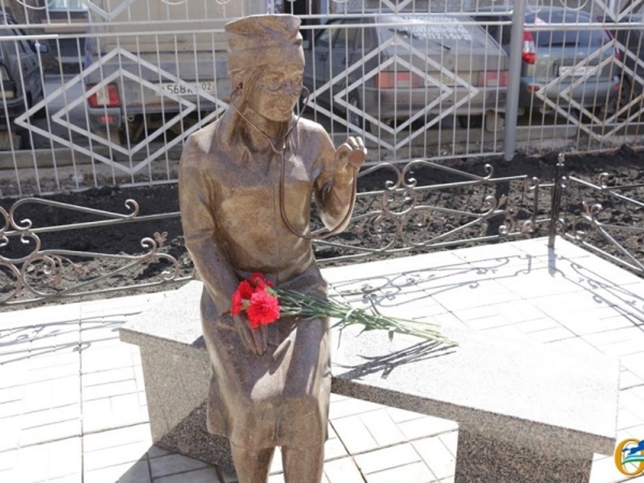 Новая скульптура — женщина-врач со стетоскопом, сидящая на кушетке — установлена весной этого года на улице Комсомольской.