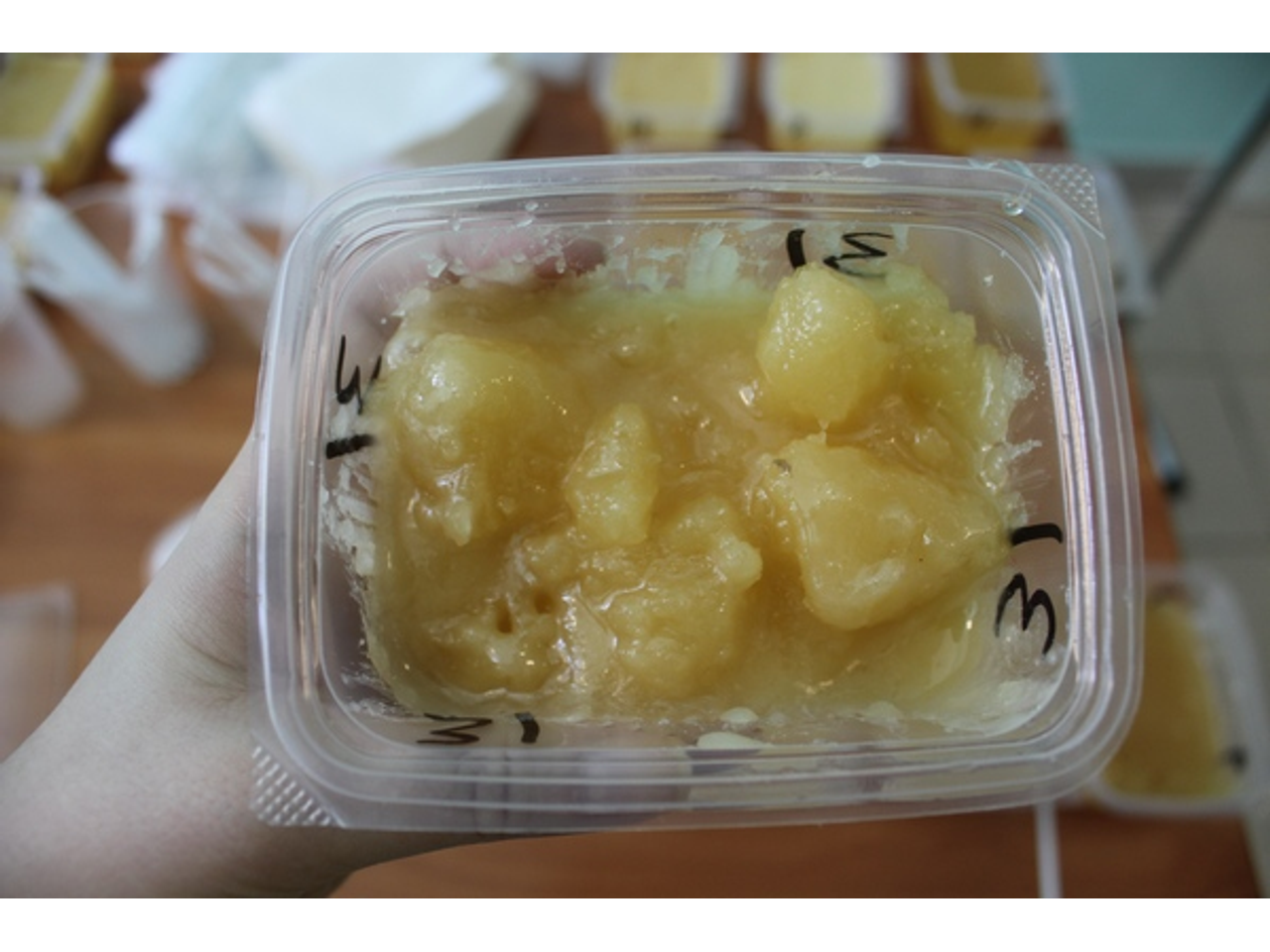 Как же происходит пыльцевой анализ меда? На начальном этапе 10 граммов меда помещается в колбу, растапливается на водяной бане. После чего мед центрифугируется на скорости 1,5-2 тысячи оборотов в минуту. В результате пыльца оседает, и этот осадок можно изучать под микроскопом. Исследователь анализирует количество пыльцевых зерен и их внешний вид (пыльцевые зерна разных растений имеют разную форму).