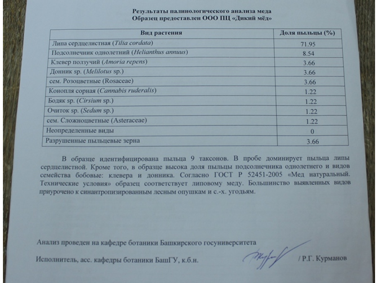 Вот, к примеру, один из типичных результатов анализа меда из Башкирии: