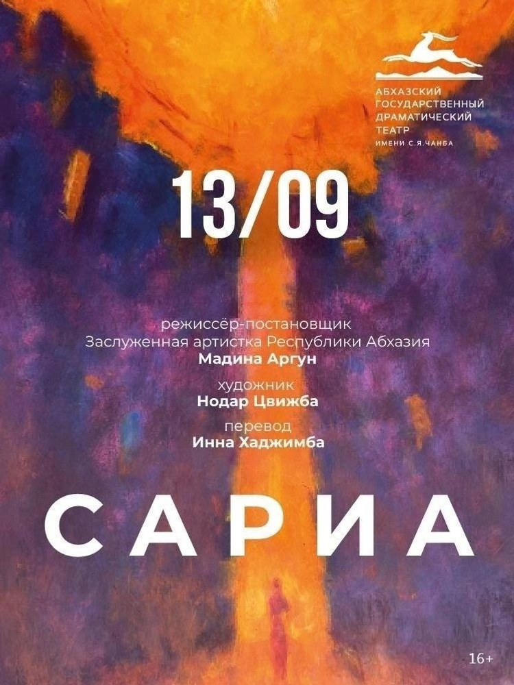 13 сентября в 19.00 пройдет спектакль «Сариа» по пьесе Зарины Конуковой. Режиссёр-постановщик — заслуженная артистка Абхазии Мадина Аргун. Эта постановка выпускницы Уфимского государственного института искусств имени Загира Исмагилова расскажет об испытаниях, которым подверглась супруга государственного деятеля советской Абхазии Нестора Лакоба.