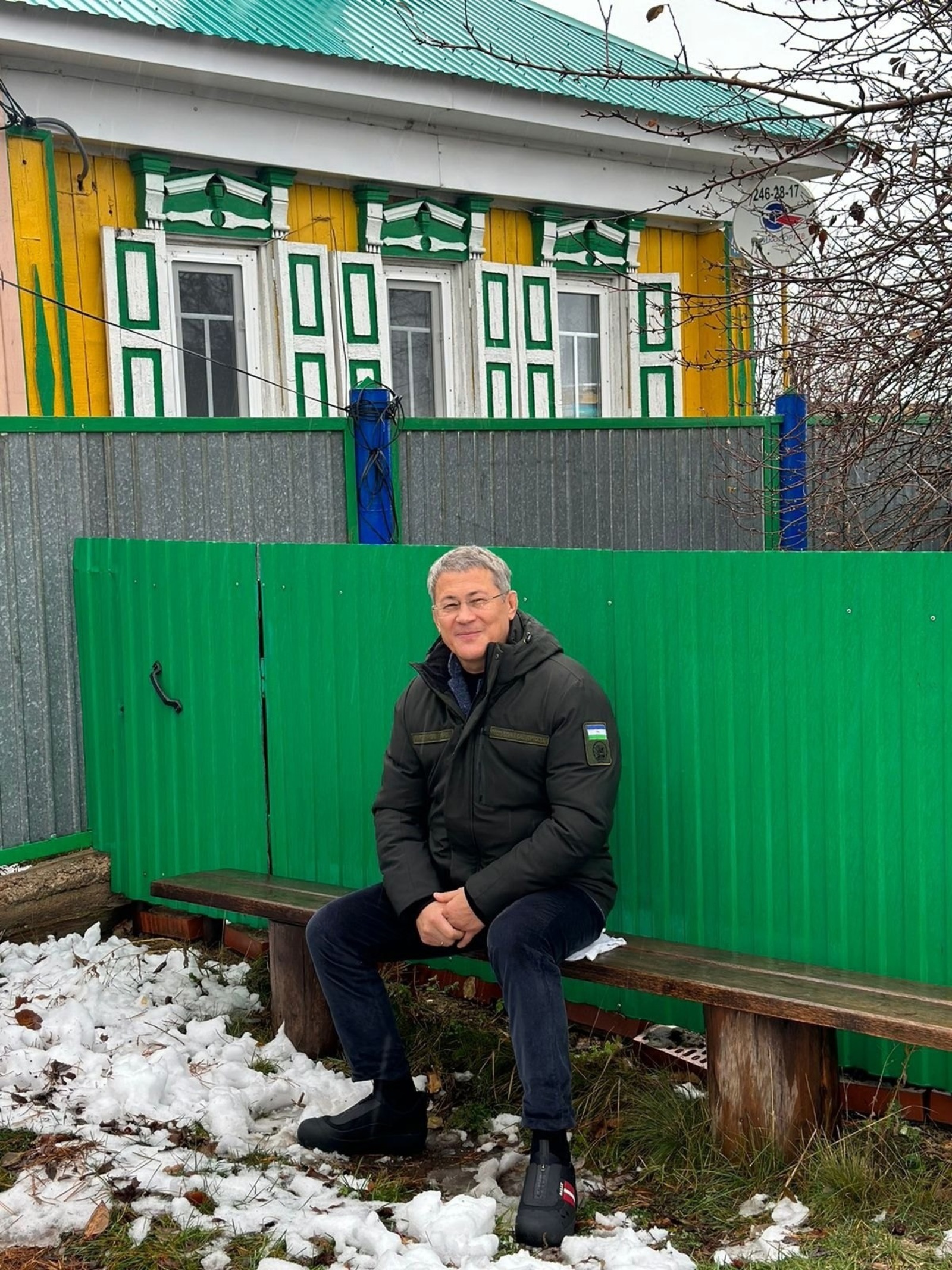 Радий Хабиров сопроводил свой пост фотографией, на которой он сидит на скамейке перед домом матери Ульфата Мустафина.